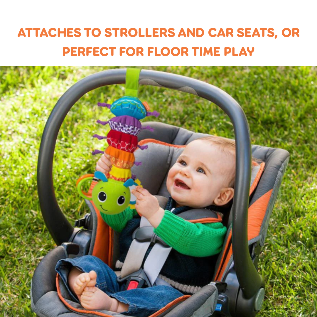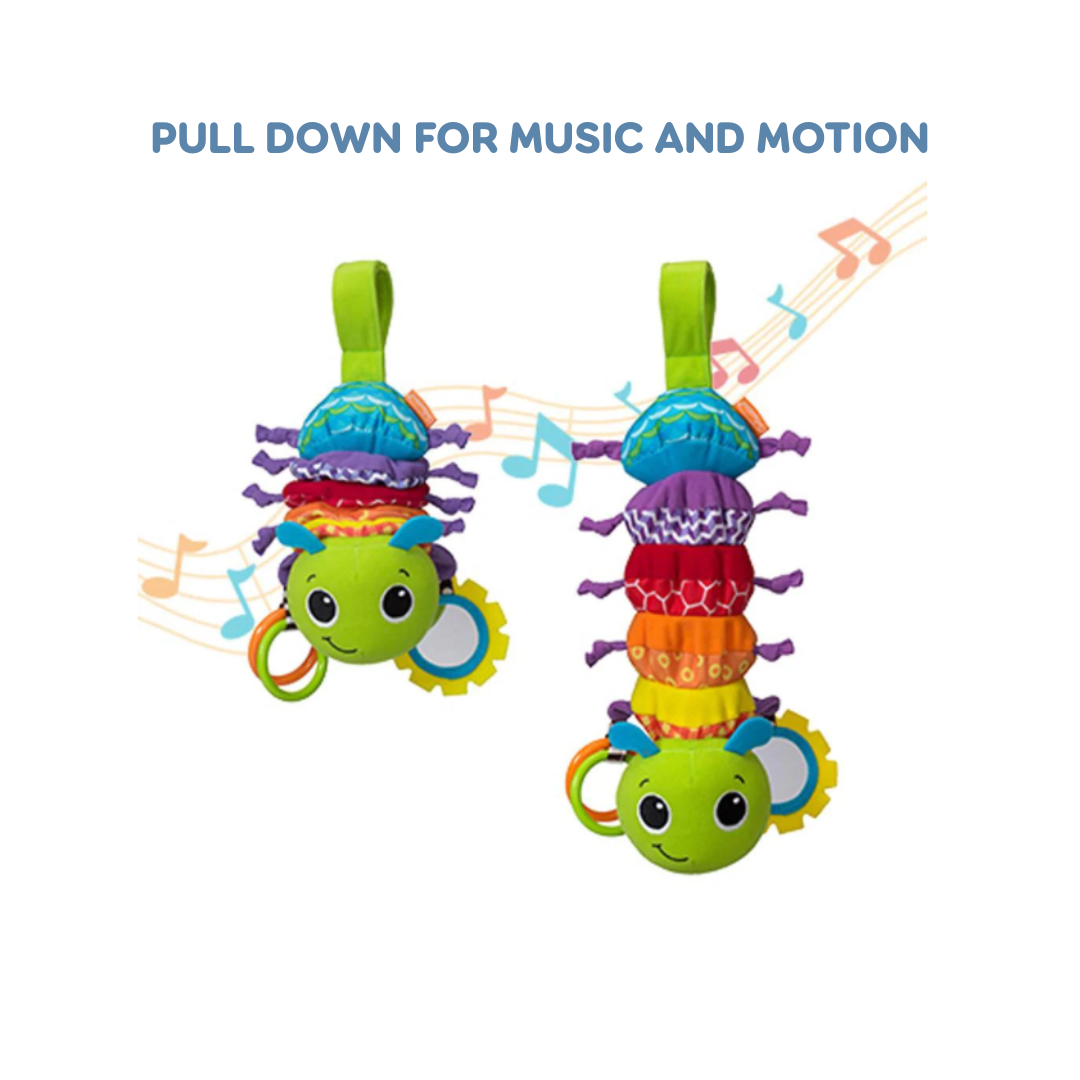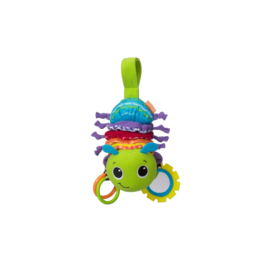 Entertain little ones at home or on the go with this huggable, tuggable musical bug! Easy to hang from car seats or strollers. Just pull on his rings to stretch out this friendly rainbow caterpillar to his full length. Then, listen to his sweet lullaby as he slowly climbs up again. Includes clacker rings for pulling and playing as well as a peek-a-boo mirror.