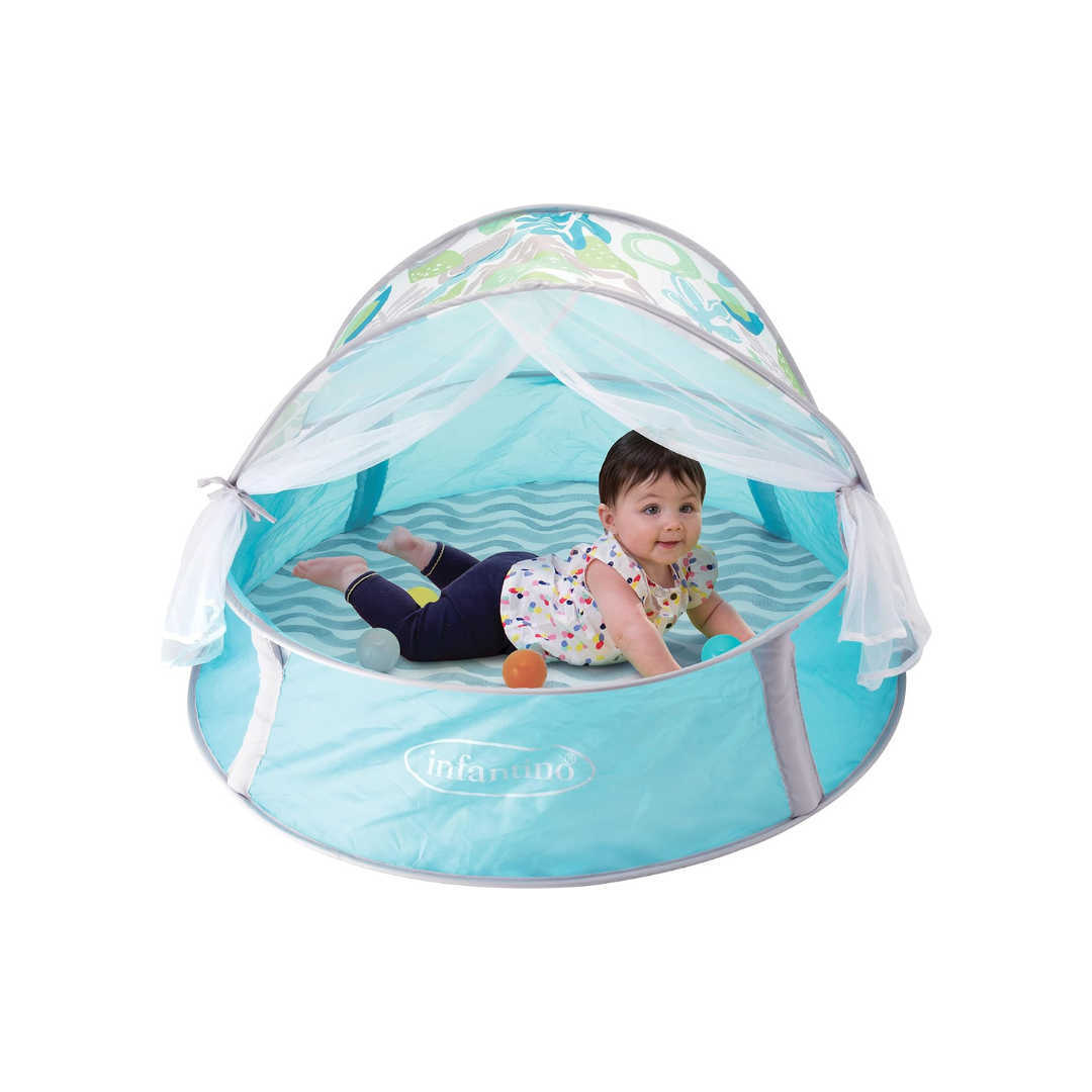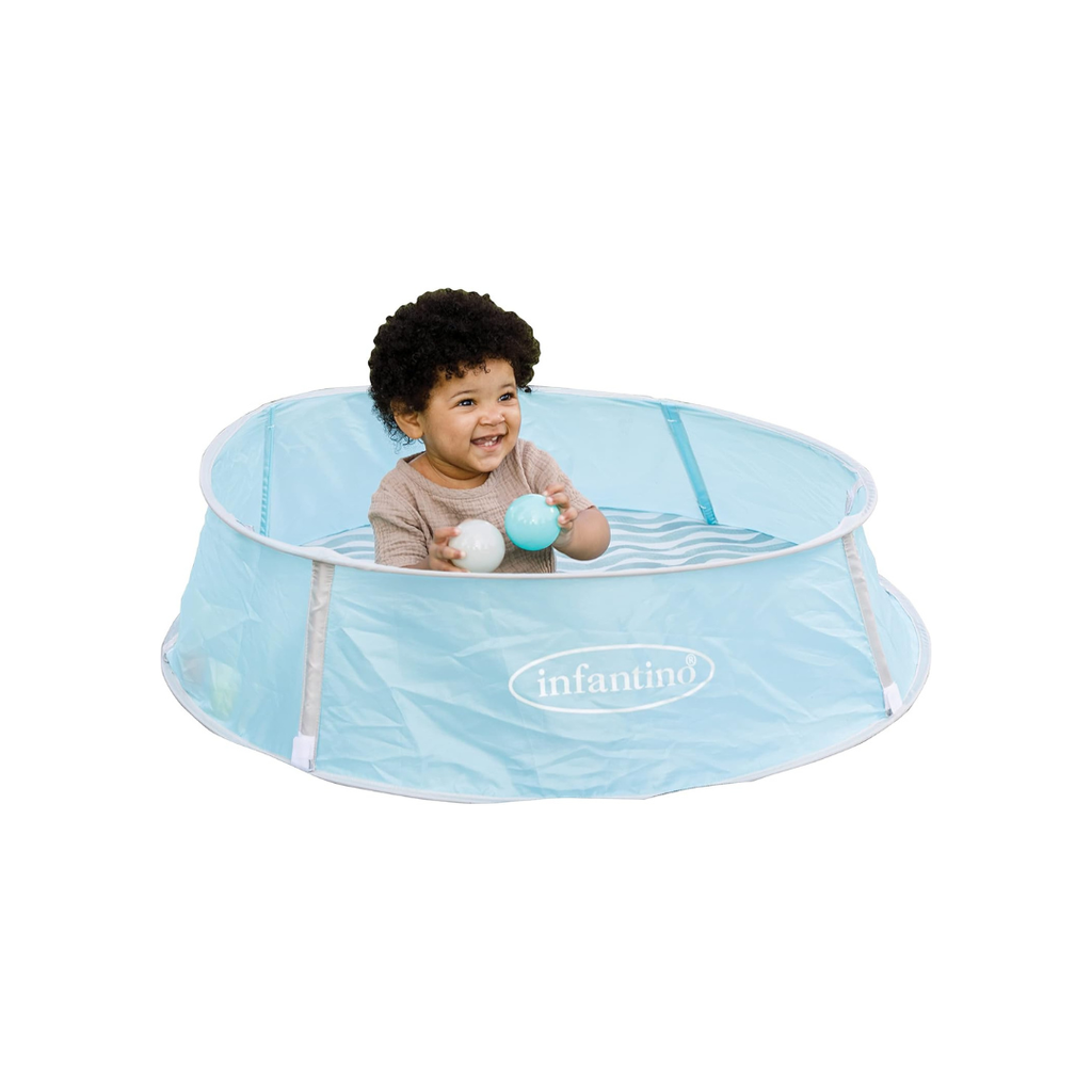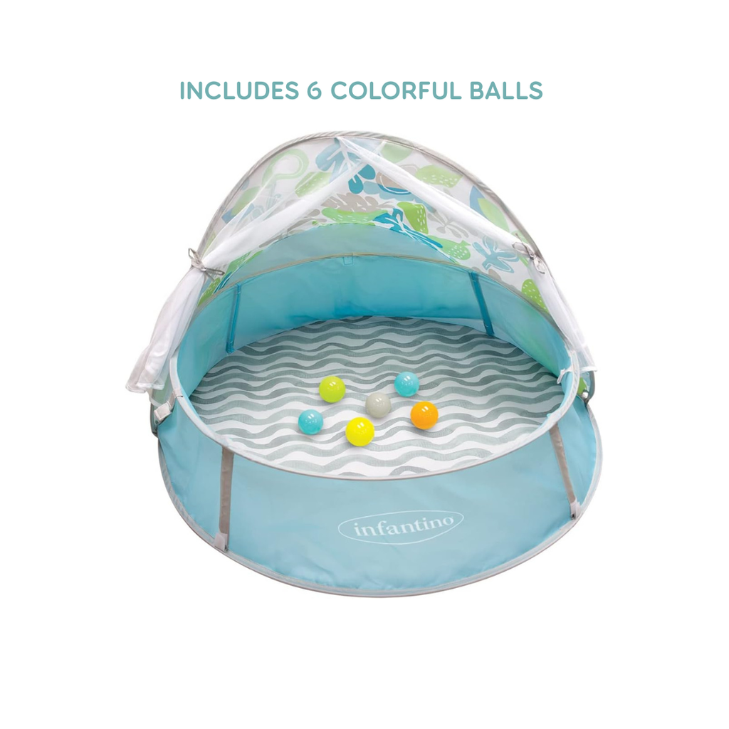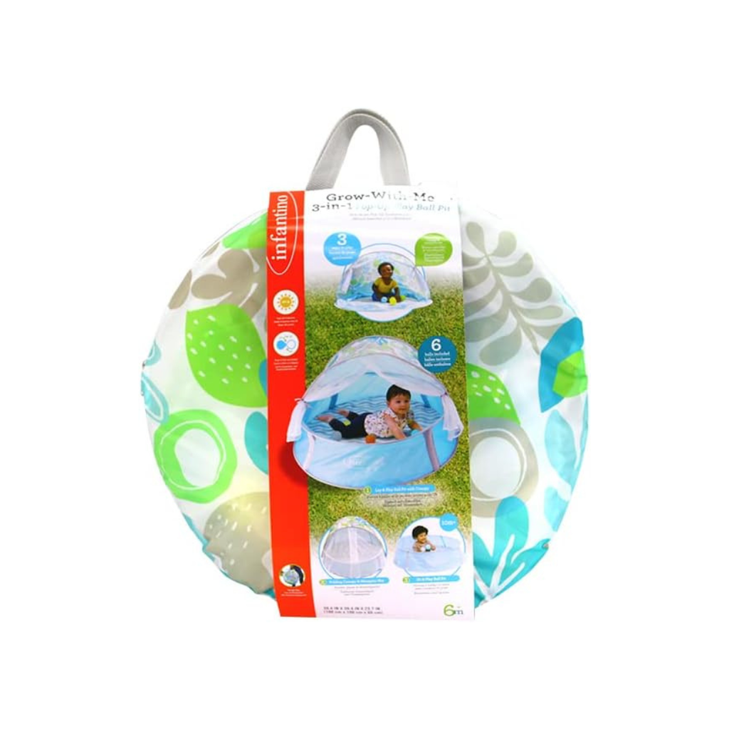 The 3-in-1 Pop-up Ball Pit by Infantino is multifunctional and ideal for playtime outdoors and indoors! Our easy to pop-up system has 4 integrated support legs that offer stability when setup. Both, walls and canopy cover offer UV protection of UPF50, making it a great space for little ones with protection from the sun. When the weather?s gloomy outside, bring the pop-up ball pit indoors to create a cozy play space for your baby! Toss the 6 colorful balls in for ball pit fun. Equipped with an adjustable fine mosquito net to keep insects out and your baby protected from bug bites. Our easy to use pop-up system makes setting up, folding and traveling with the 3-in-1 Pop-up Ball Pit a breeze. When the fun is done simply fold this multifunctional play destination into the travel bag with handle for compact storing.