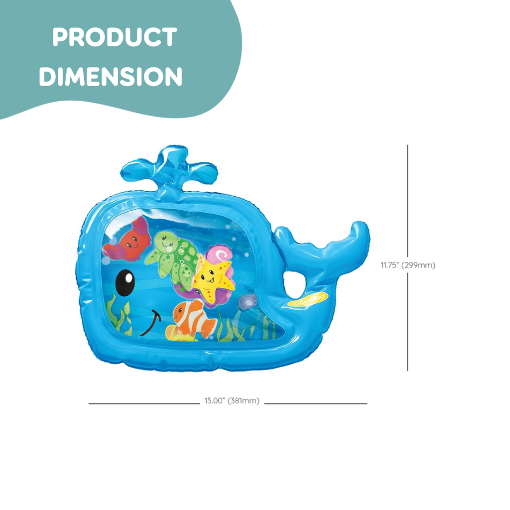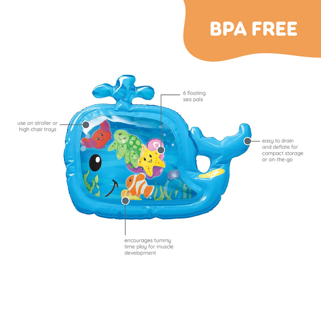 This large squishable mat is perfect for muscle strengthening during tummy time. Babies will Giggle at and love the six floating sea Pals that swim off as they try and grab at them with Little hands. Baby will learn cause and effect when they press on different areas of the mat and the sea Pals move around in different directions. Unique design & extra Large; no ordinary shapes here! This 18x27 inches nautical themed mat is shaped like a gigantic narwhal letting baby explore its squishy tail and other baby safe edges. Who doesn't love a Unicorn of the sea? Simply fill the outer edge with air and the inner mat with water (there is a water line to show how high to fill the mat). Easily deflates and drains and folds up tight for babies on the go!