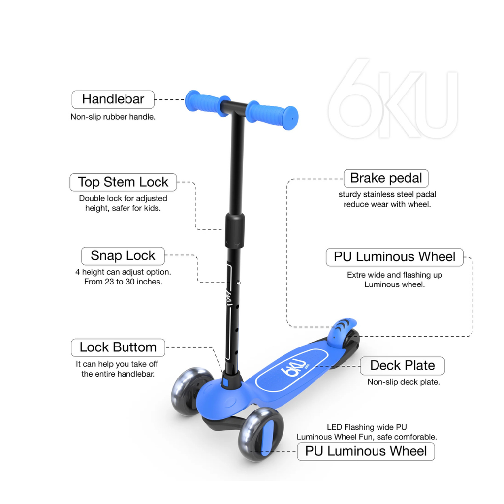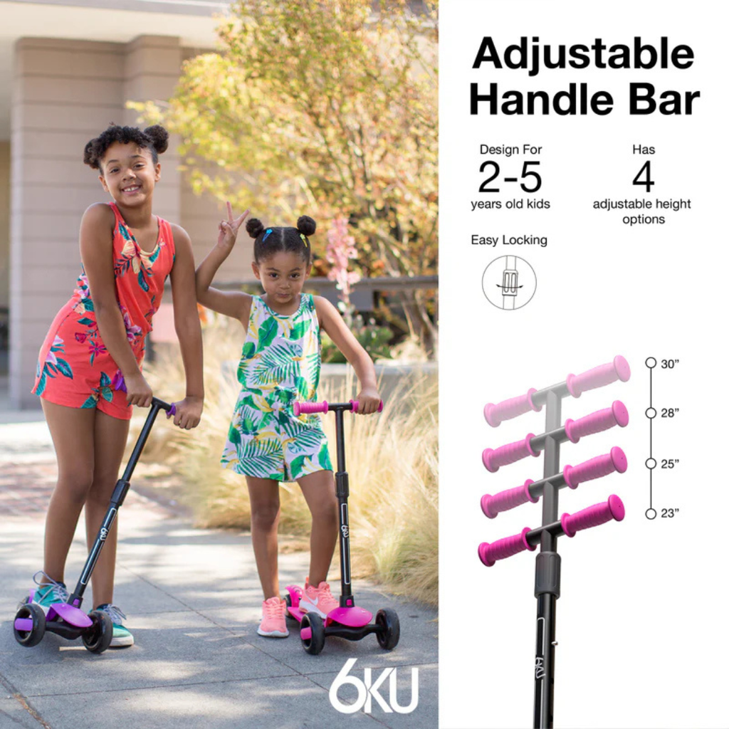 The 6KU Kick Scooter is a smoothest and quietest kids scooter, with its lightweight design, 3 flashing wheels and lean to steer, makes riding a scooter fun and easy for kids to play with. The 6KU Kids Scooter is equipped with 4 adjustable height handlebars so you can child can continue to use their scooter as they grow.