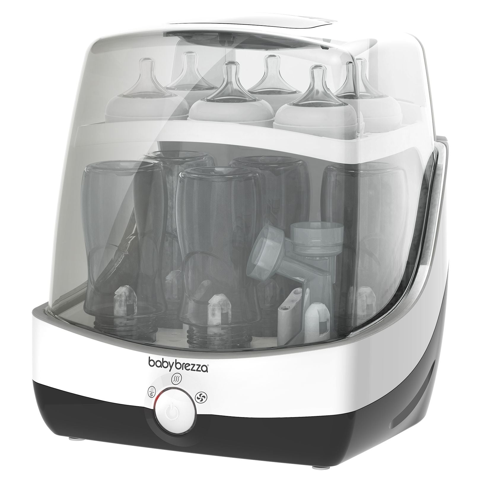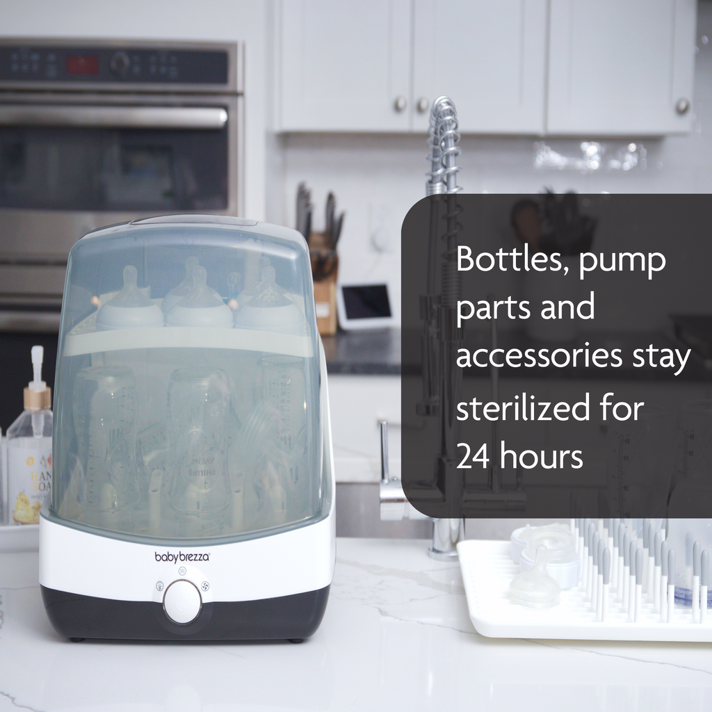 The Baby Brezza SuperFast Sterliser-Dryer works SUPERFAST automatically serilises and