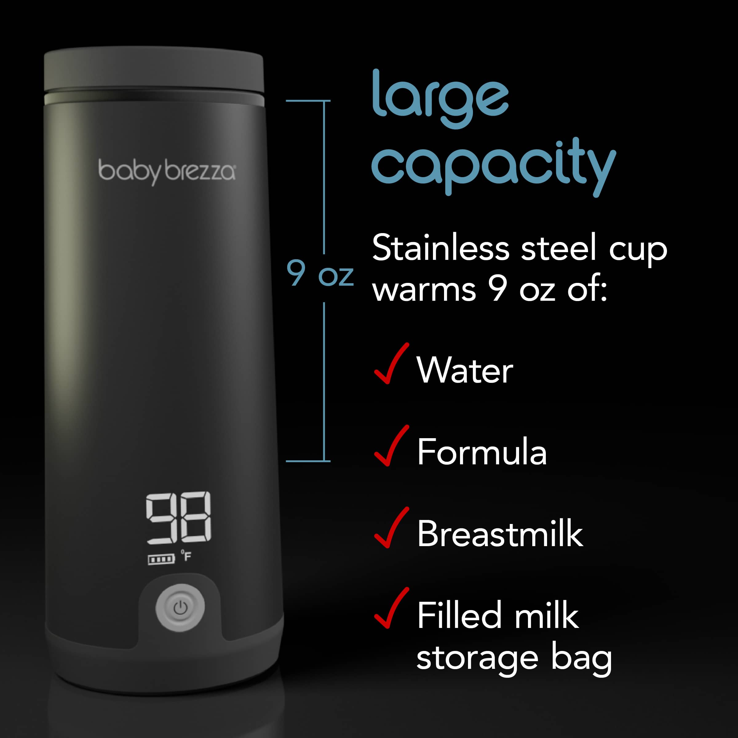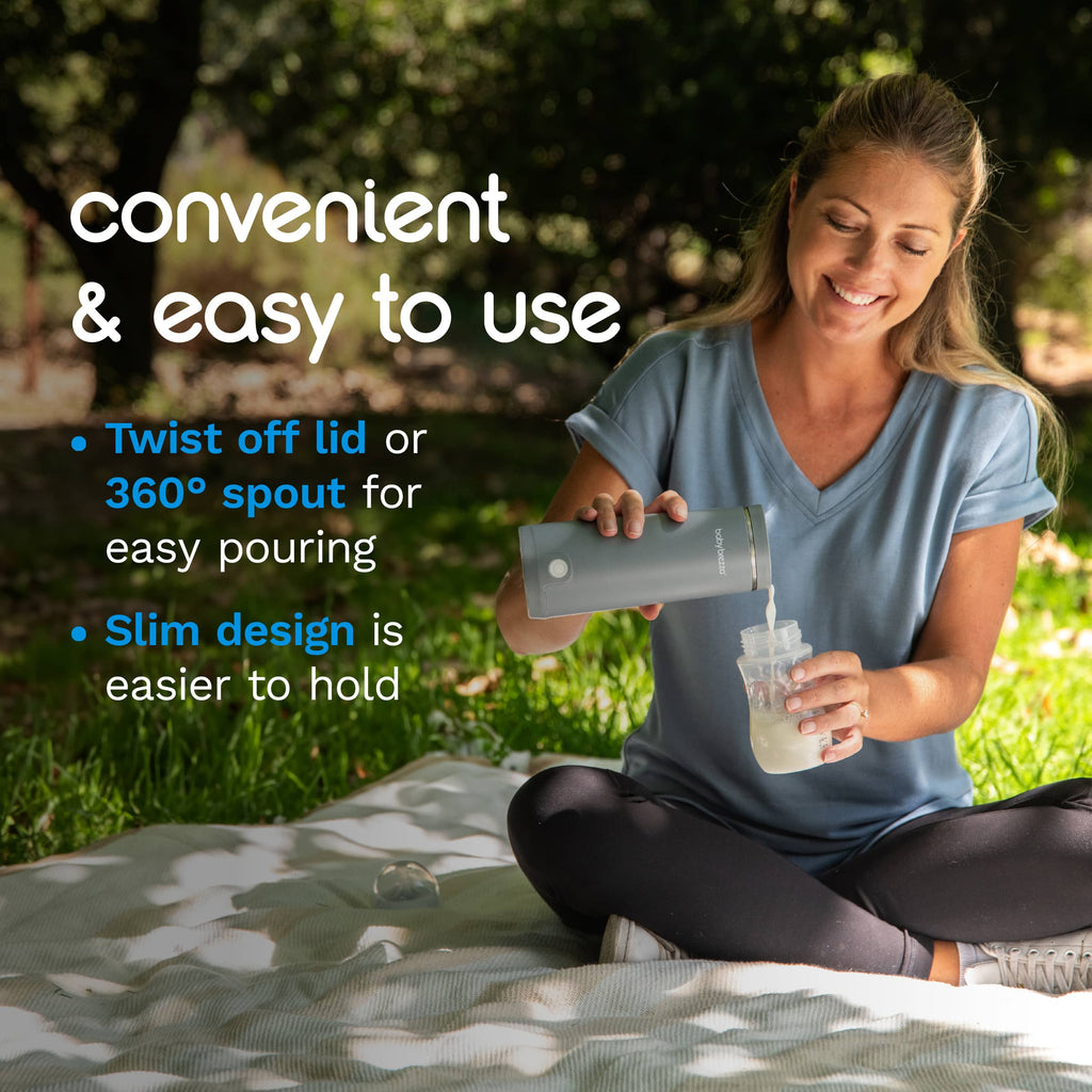 • Large capacity, slim & compact design: Stainless steel cup holds 9 oz of water, formula or breastmilk, or a filled 6 oz milk storage bag. Easily fits in cupholders or bottle pockets in diaper bags, backpacks, cars & strollers.