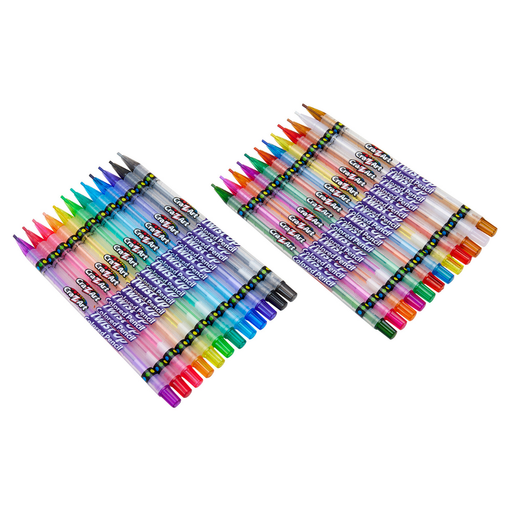 Cra-Z-Art's 24c count twist up colored pencils are the new way to color. With the twist up action there is no sharpening necessary, a fresh point every time. The pencils have thick, strong leads. There are 15 bright, vivid colors each for smooth coloring. School quality and non toxic