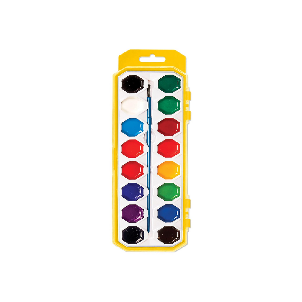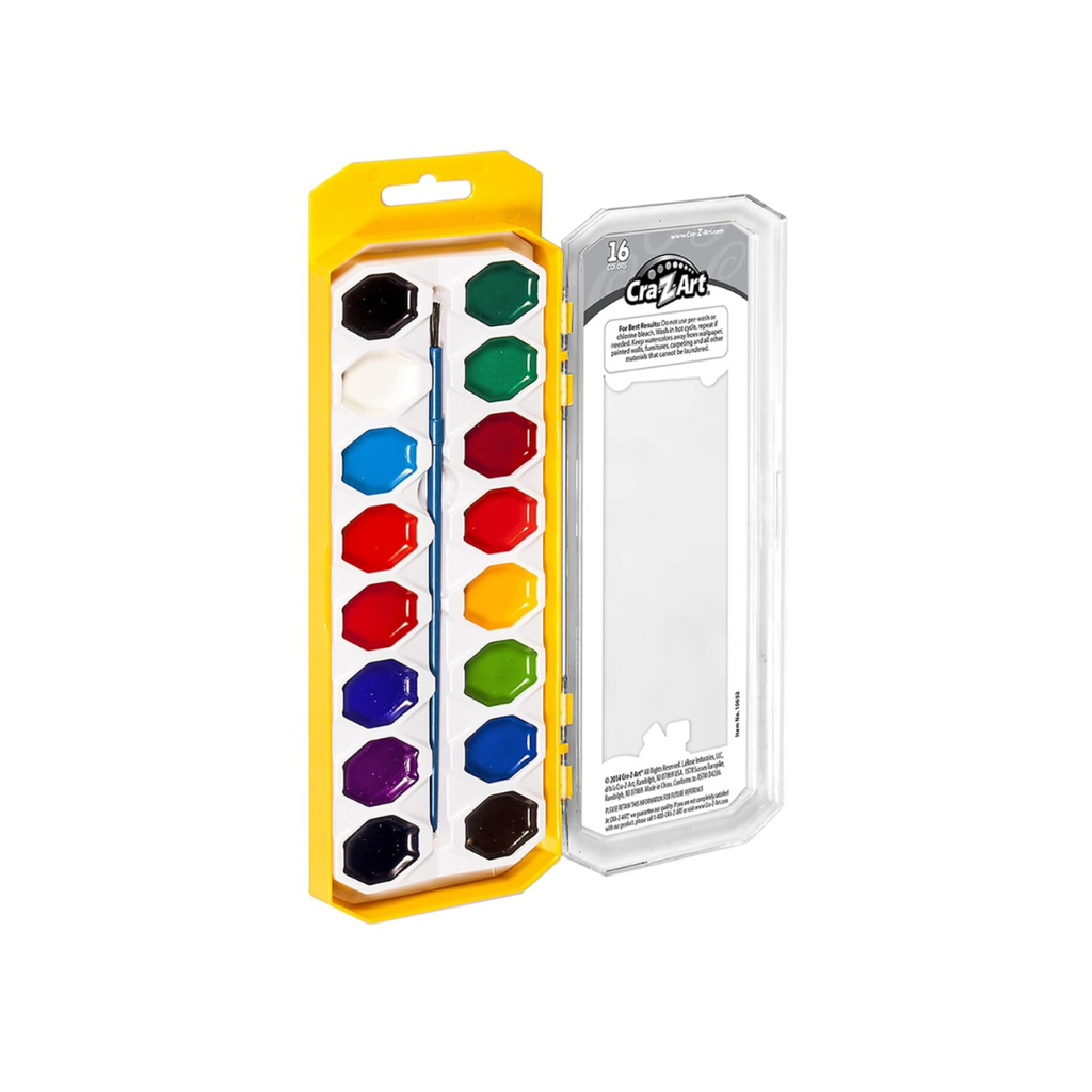 Cra-Z-Art 24 Color Washable Watercolors 24 count, include a vibrant painting palette that sparks imagination. Featuring 24 tabs of watercolor paint in a wide range of colors, including red, yellow, orange, green, dark blue, light blue, brown, black, and more, this set allows artists to create without the need for mixing colors. Complete with an artist brush, these watercolors offer endless potential for arts and crafts, home projects, or school activities. The fully washable and easy-to-clean paints make it an ideal choice for kids aged 3 and up, ensuring a mess-free and enjoyable artistic experience. Elevate your creative endeavors with this must-have set, perfect for bringing colorful inspiration to any project, big or small.