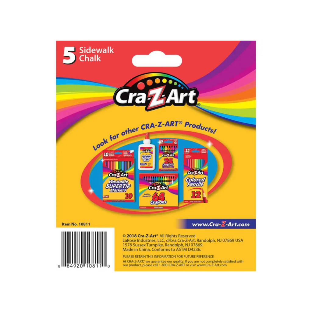 Let your creativity go wild with the Cra-Z-Art Sidewalk Chalk, 5 Count! Draw with high quality chalk that breaks less, is easy to grip, and lasts longer! Our non-Toxic Sidewalk Chalk is perfect for all your cool creative designs! Have fun outside decorating sidewalks and other hard surfaces with your very own designs, or on chalk specific surfaces such a chalk paint walls, chalkboards, and easels. Create lasting memories with friends and family by making hopscotch boards, chalk bullseye, 4 square, mazes, sidewalk twister, tic-tac-toe, and more! Chalk is long-lasting, washable, nontoxic, and a whole lot of fun! Set includes: 5 different colored sidewalk stick pieces. Be "always creative" with Cra-Z-Art
