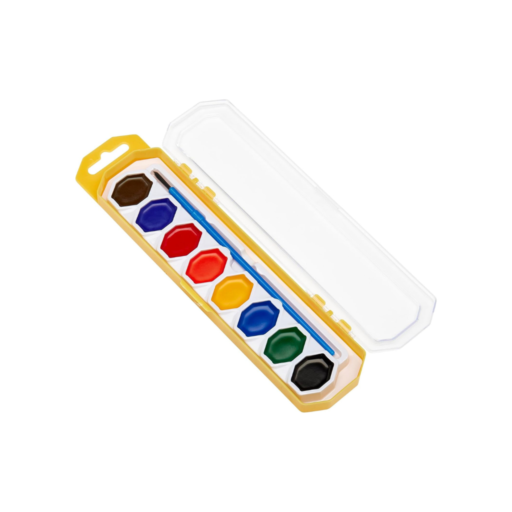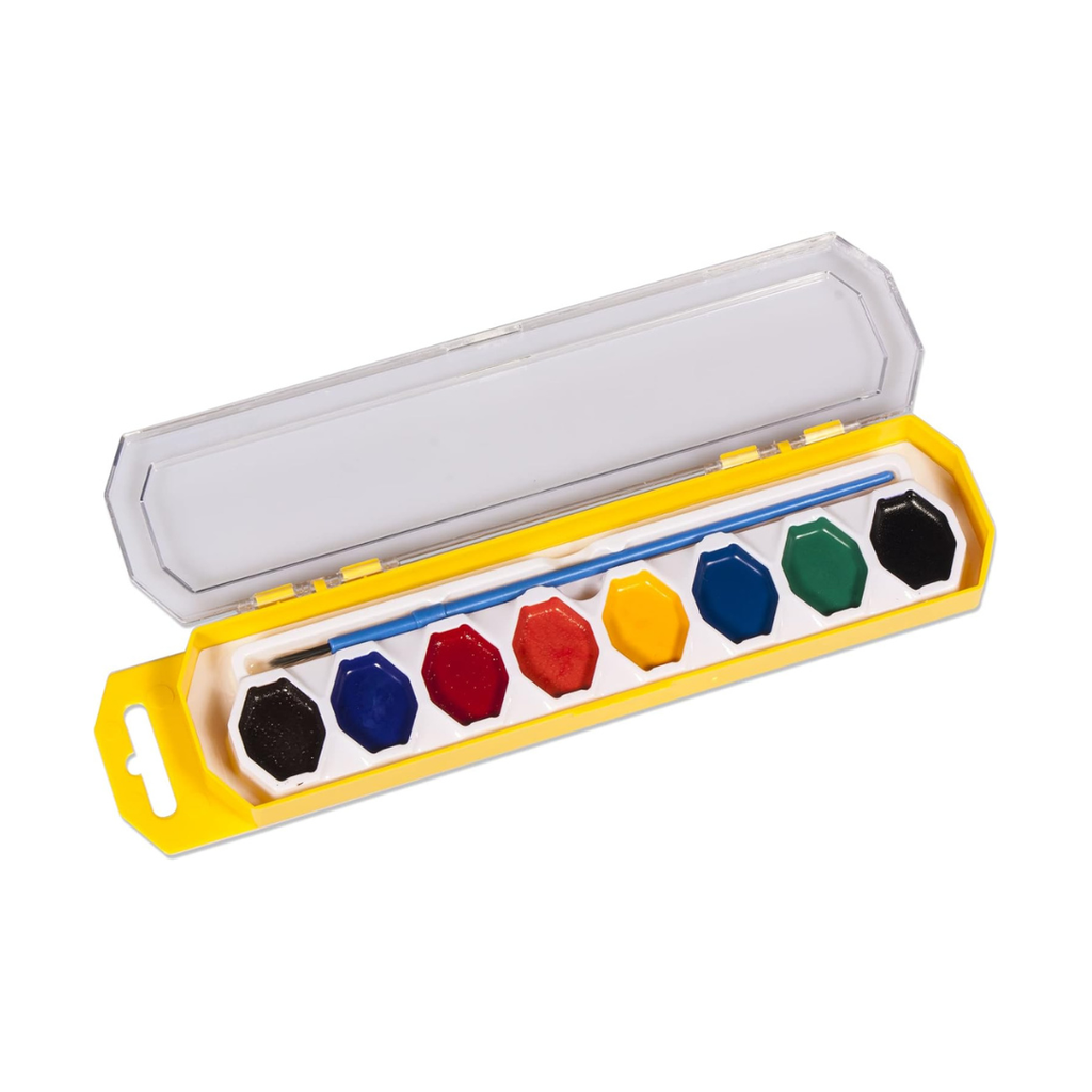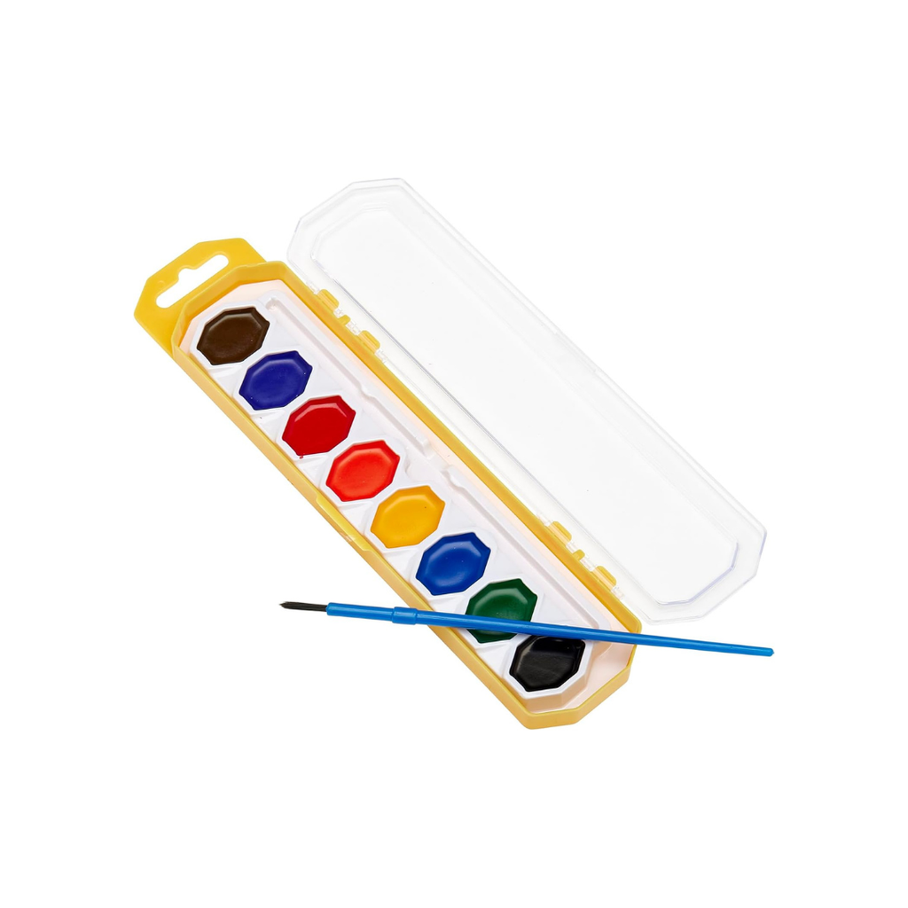 8 ct Washable Watercolors W/Brush Strokes of genius to keep creativity flowing! These worry-free watercolors feature 8 brilliant colors and 1 artist brush to help kids paint like Van Gogh without leaving permanent marks or making a huge mess. Help kids appreciate the translucency of watercolors and explore application techniques. Teach them to wet the brush in between colors and dab on a paper towel to remove excess water and control color richness. Great for school or home arts and crafts. Dip in!