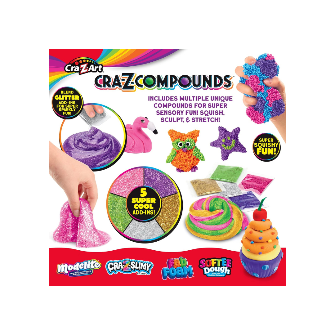 Cra-Z-Compound with 7 Cool add ins get creative with modelite, slime, foam and dough. Decorate with the 7 add ins!