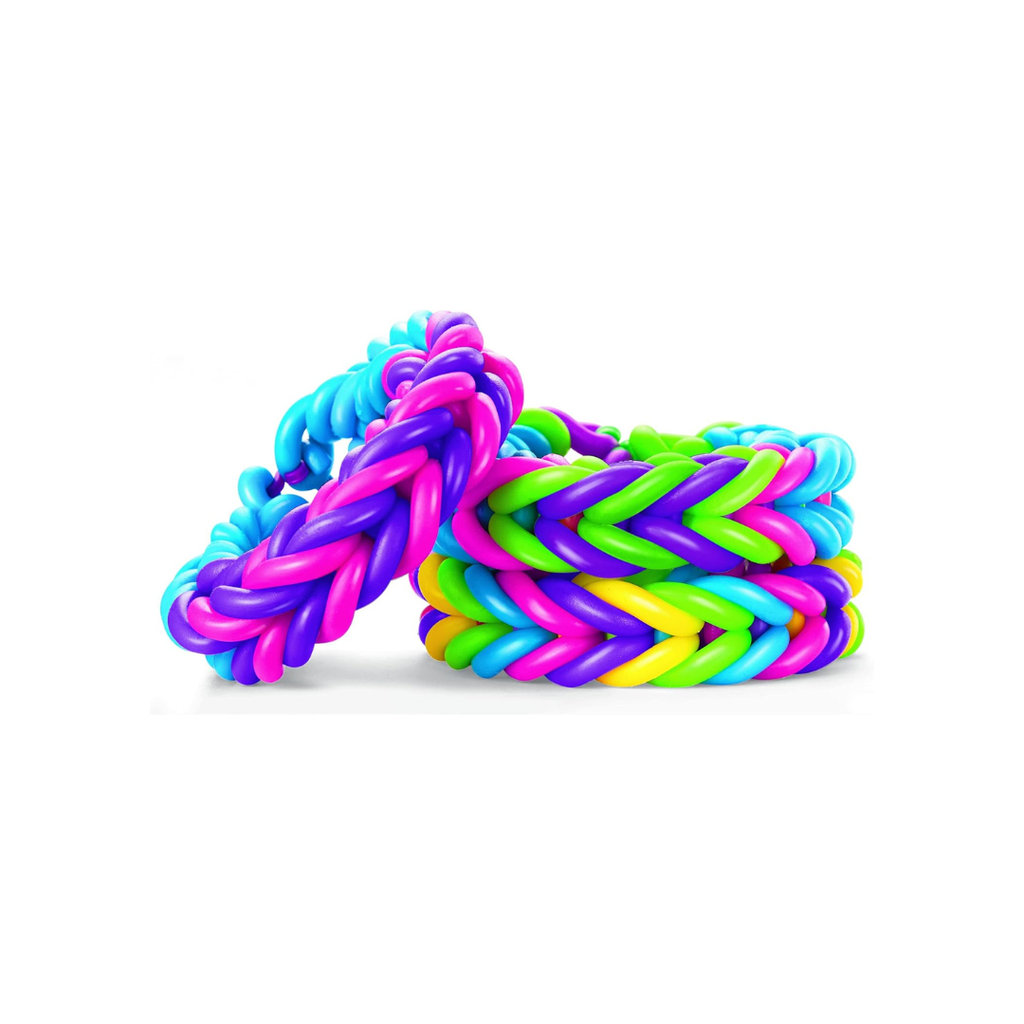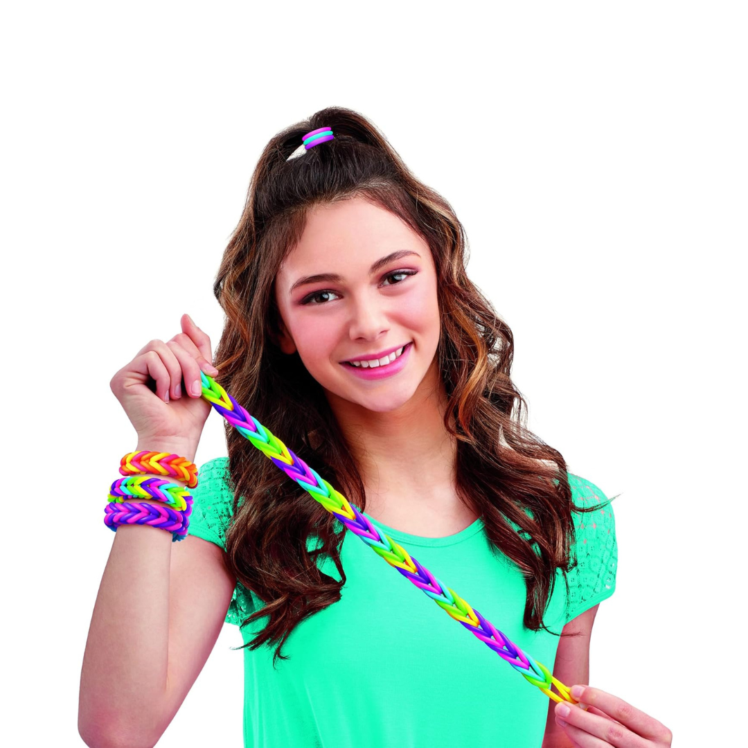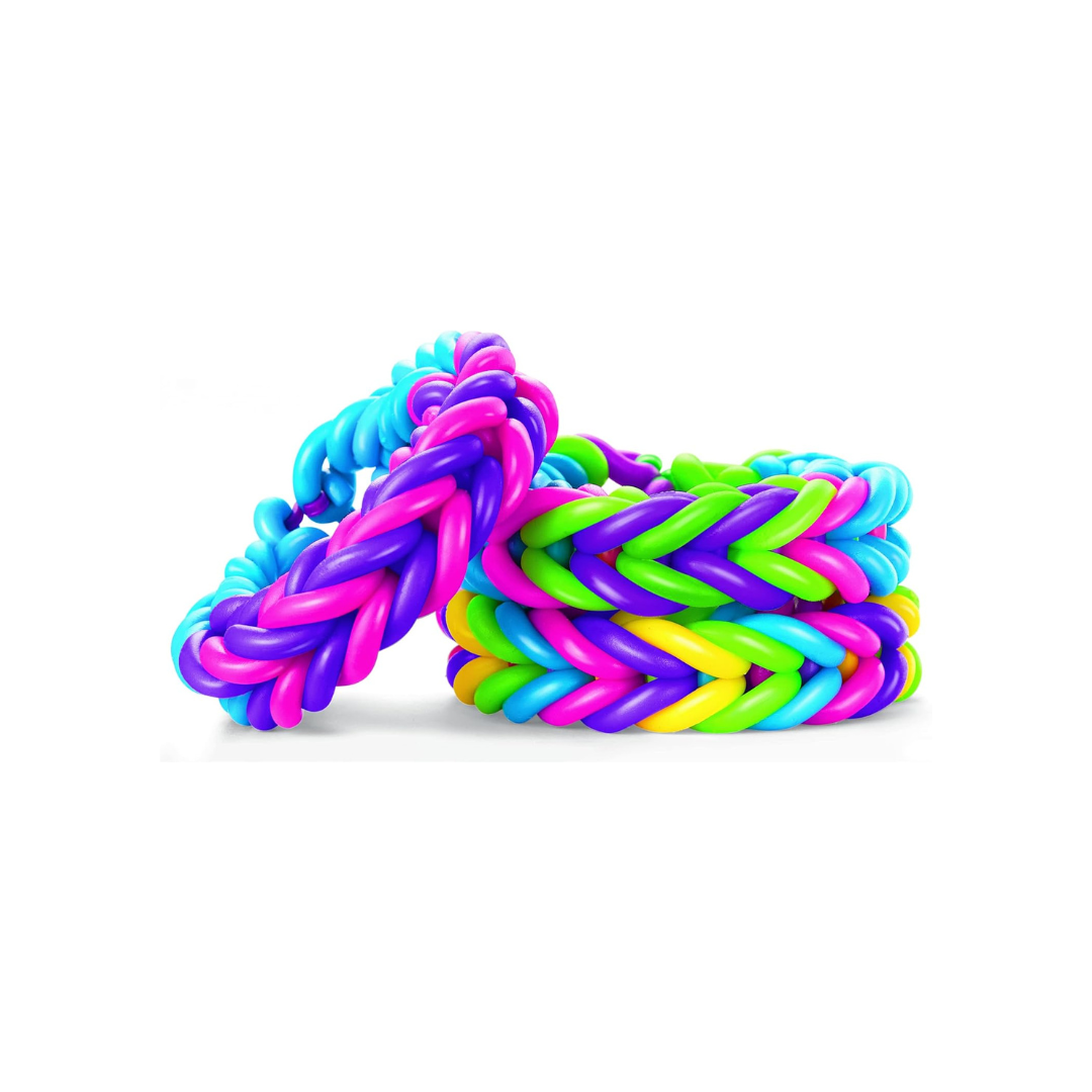 Simply loop and loom to make two amazing bracelet styles — the single loop fishtail, an easy yet impressive favorite, or the double loop fishtail, a fun twist on a classic design. The bigger, softer bubble bands are a super stretchy take on traditional loom bands, giving your creations a bold, bouncy look and feel.