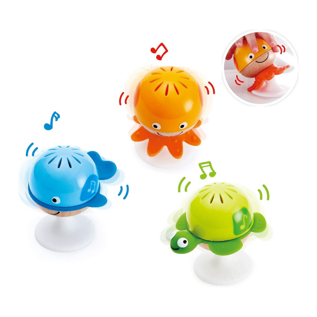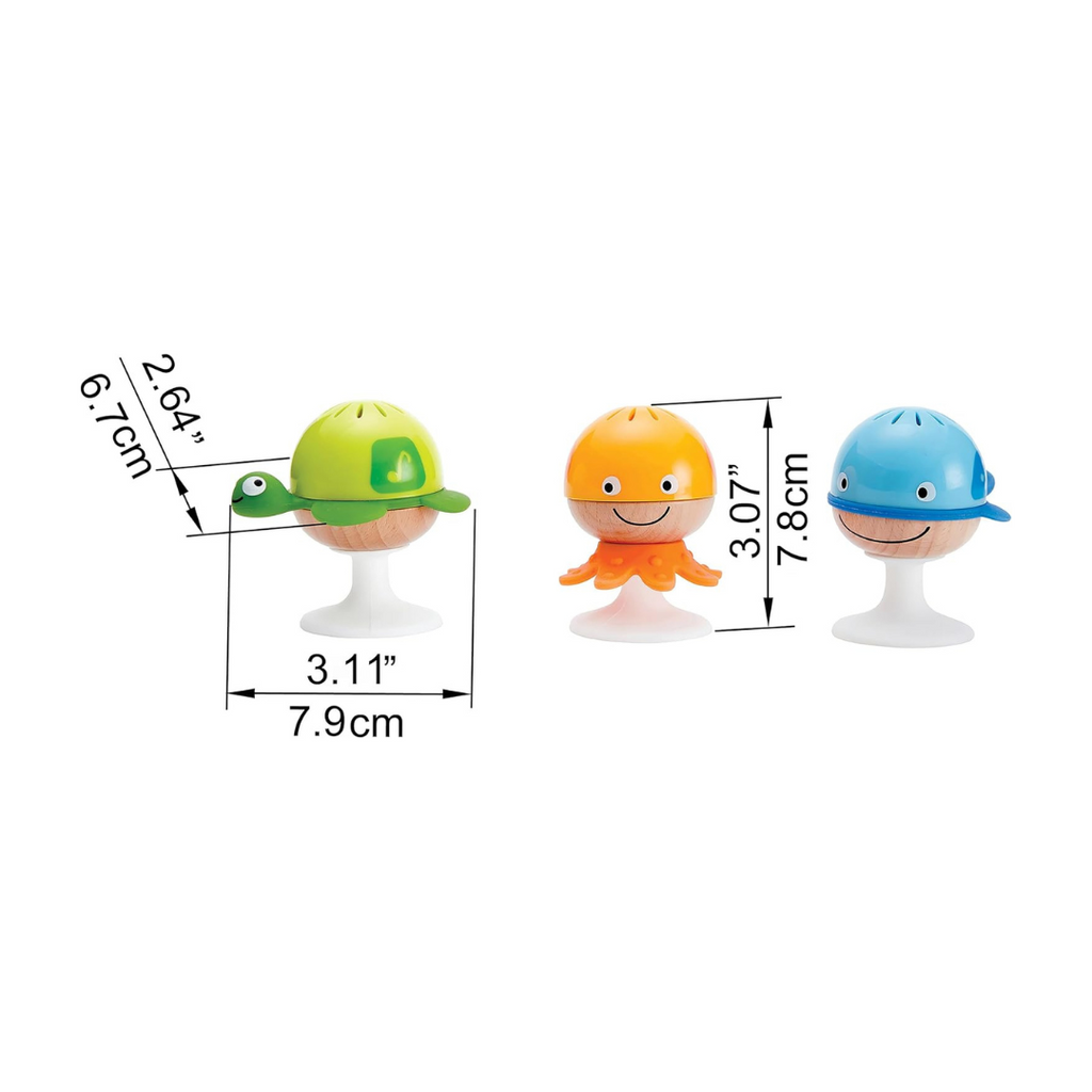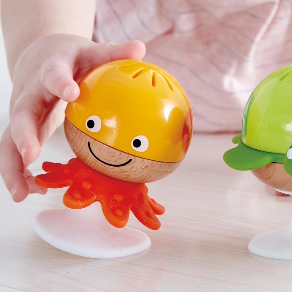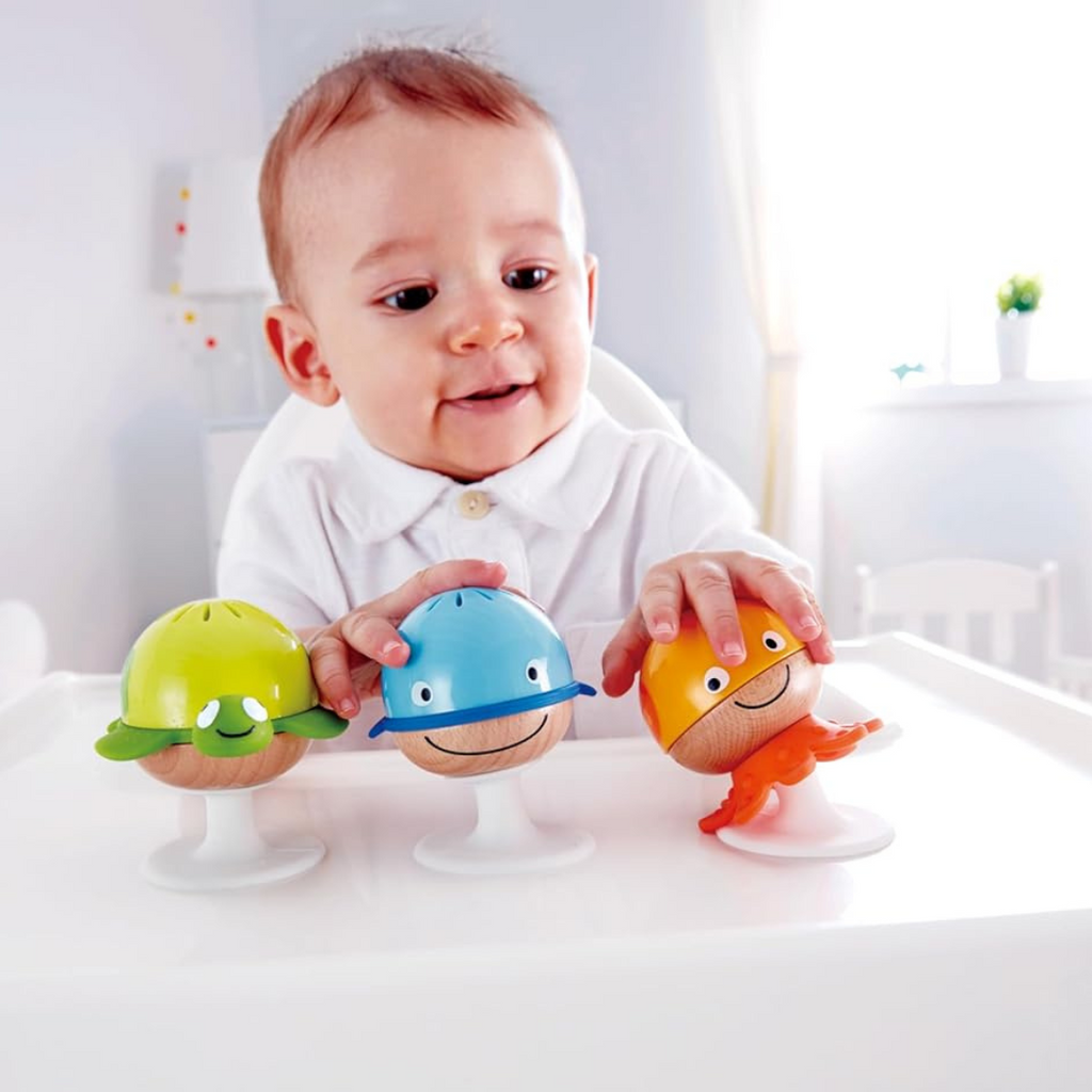 Babies will be enchanted by the Stay-put Rattle Set’s differing sounds, bright colours and aquatic animals. Moreover, with their handy suction cups, playtime is possible anywhere, anytime!