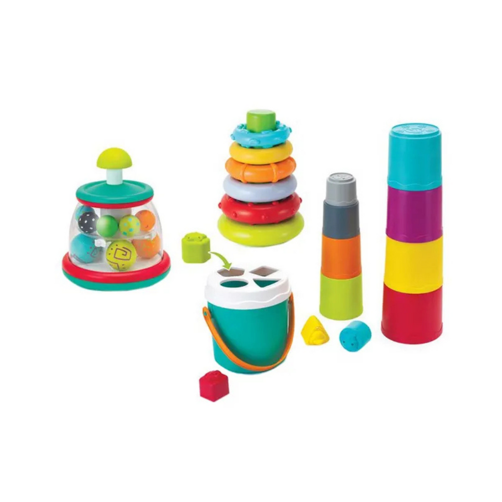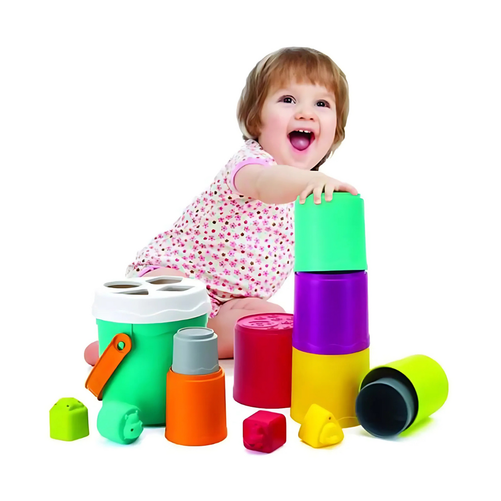 - A set of 8 cups in different colors and a bucket with a sorter cover with holes through which you can throw colorful blocks in geometric shapes. Each cup is a different size so you can build a tower out of them.