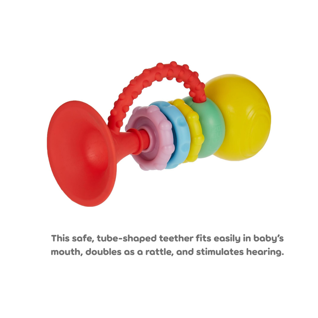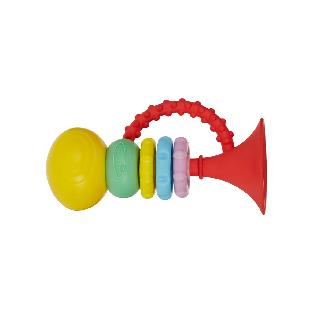 Teething rattle "Trumpet". The Infantino "Trumpet" teething rattle is a unique toy that combines the functions of a rattle and a teething ring, making it versatile and useful for your baby. It has an attractive design, bright colors and a unique shape that makes it easy for baby to grasp. The unique shape of the tube allows you to massage your gums, which relieves pain and speeds up the teething process.