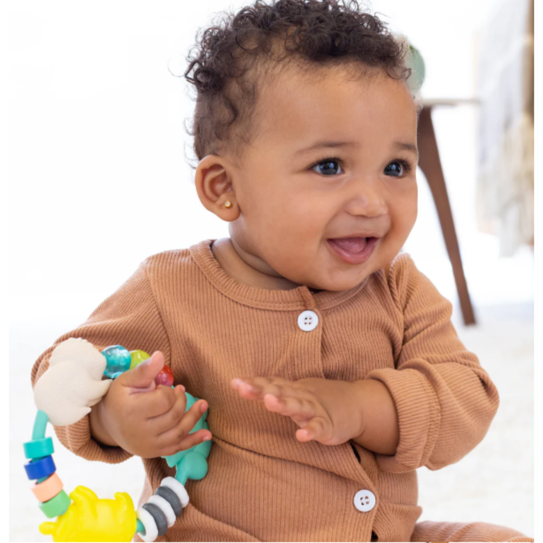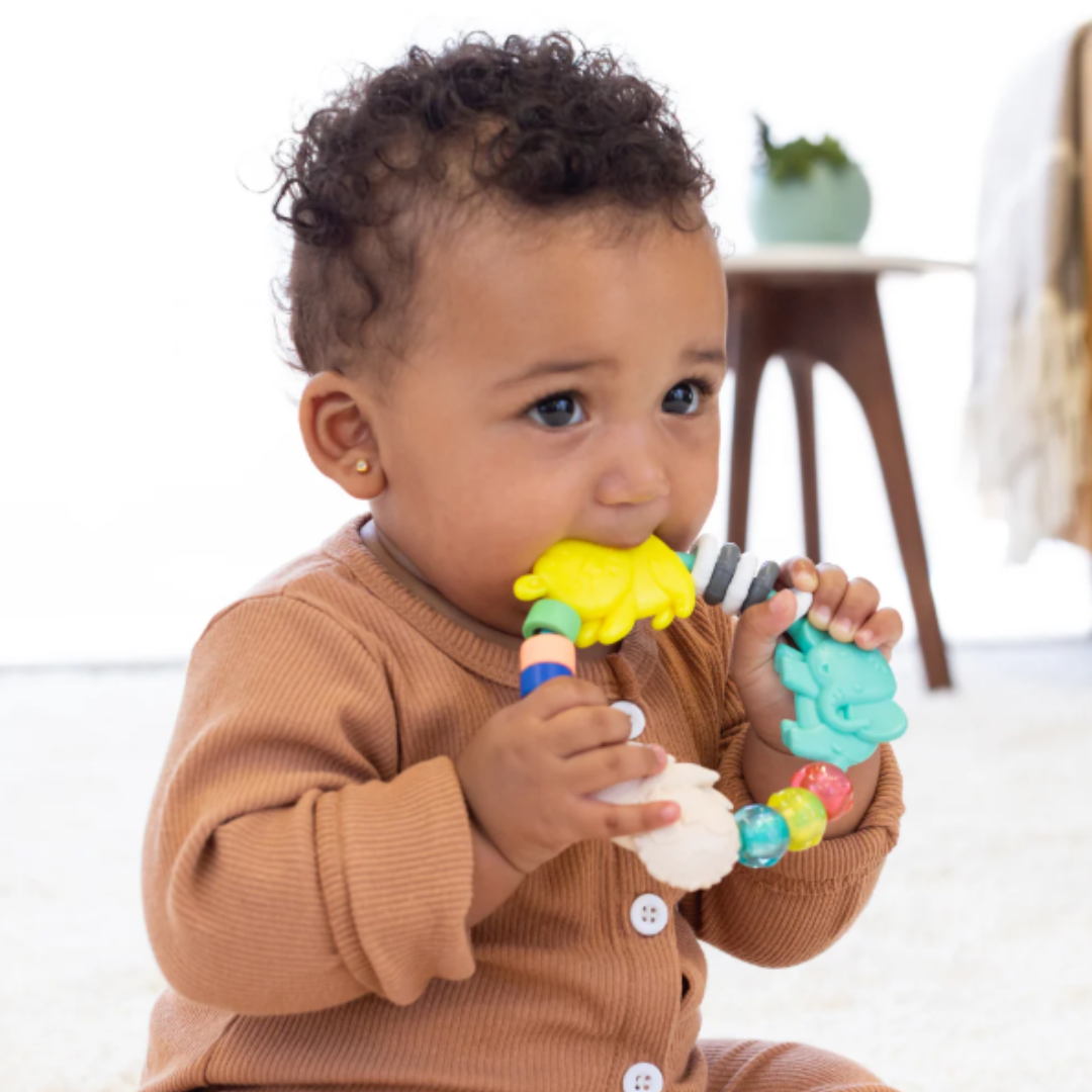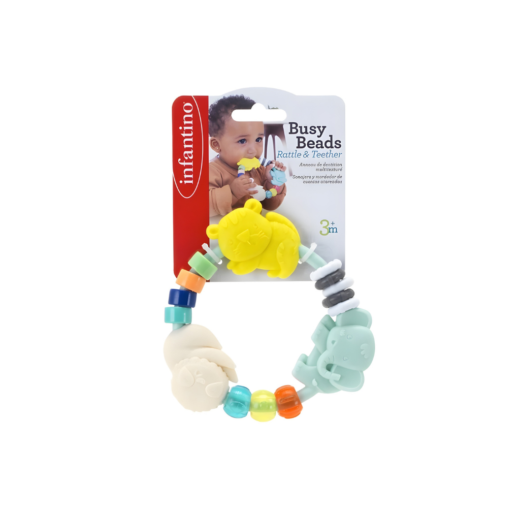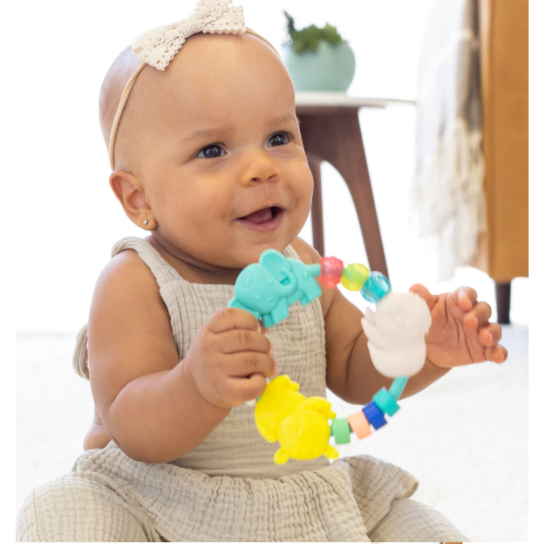 Babies will love this easy to grasp teething ring featuring soft, multi-textured beads & chasing gummy buddies. Fun no matter how you spin it!. Multi-textured soothing beads and animal shapes are perfect for teething.