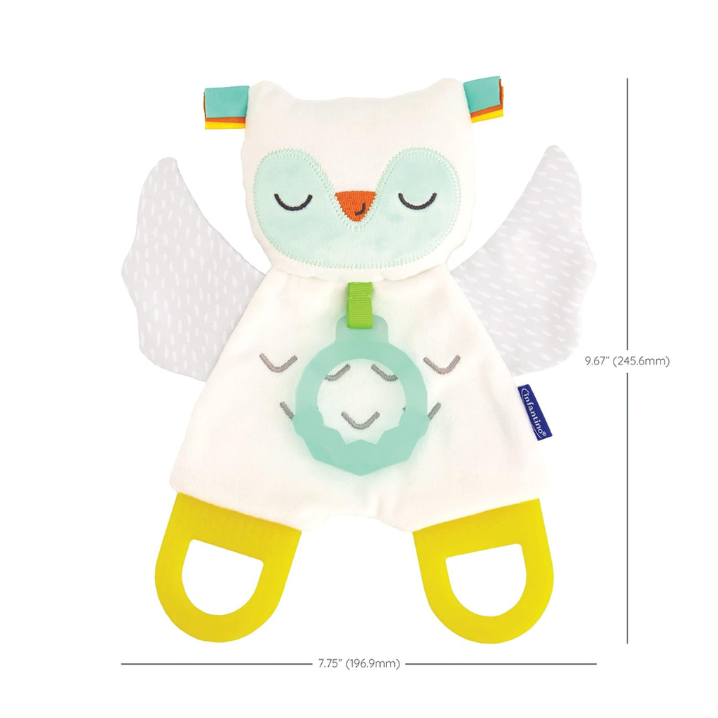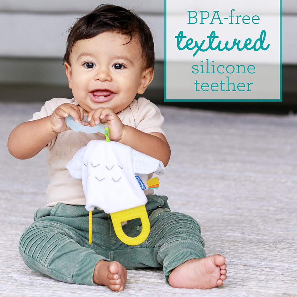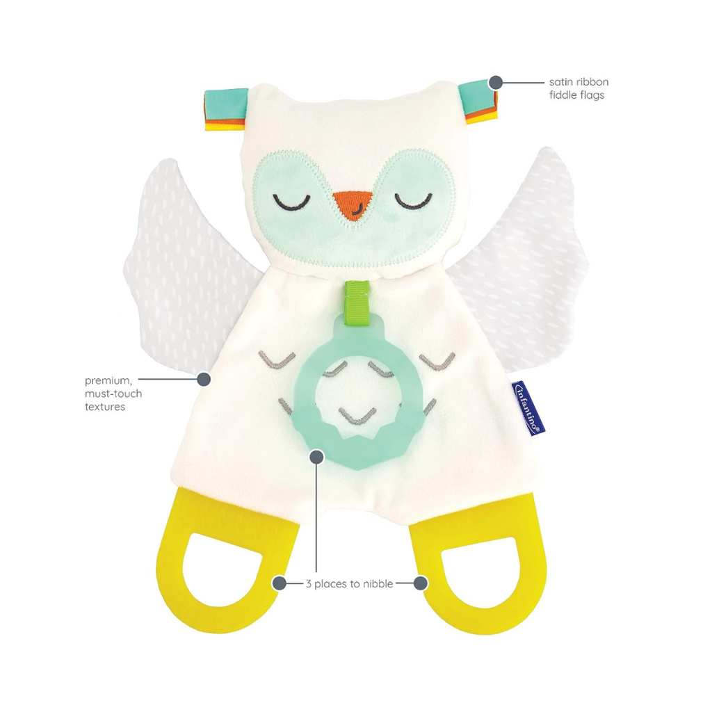 This super soft and teethable Owl is fun to snuggle and play with. Busy little hands will love exploring colorful fiddle flags, soft premium fabrics, sweetly patterned crinkle wings, and a soothing BPA-free round textured teether. Your baby can cuddle, play and teethe with this cute pal at home or on the go. Plus, it's soft glow-in-the-dark feature is great for extended play at night. Three places to nibble plus soft premium fabrics make the Glow-in-the-Dark Cuddly Teether a teething and self-soothing must-have!