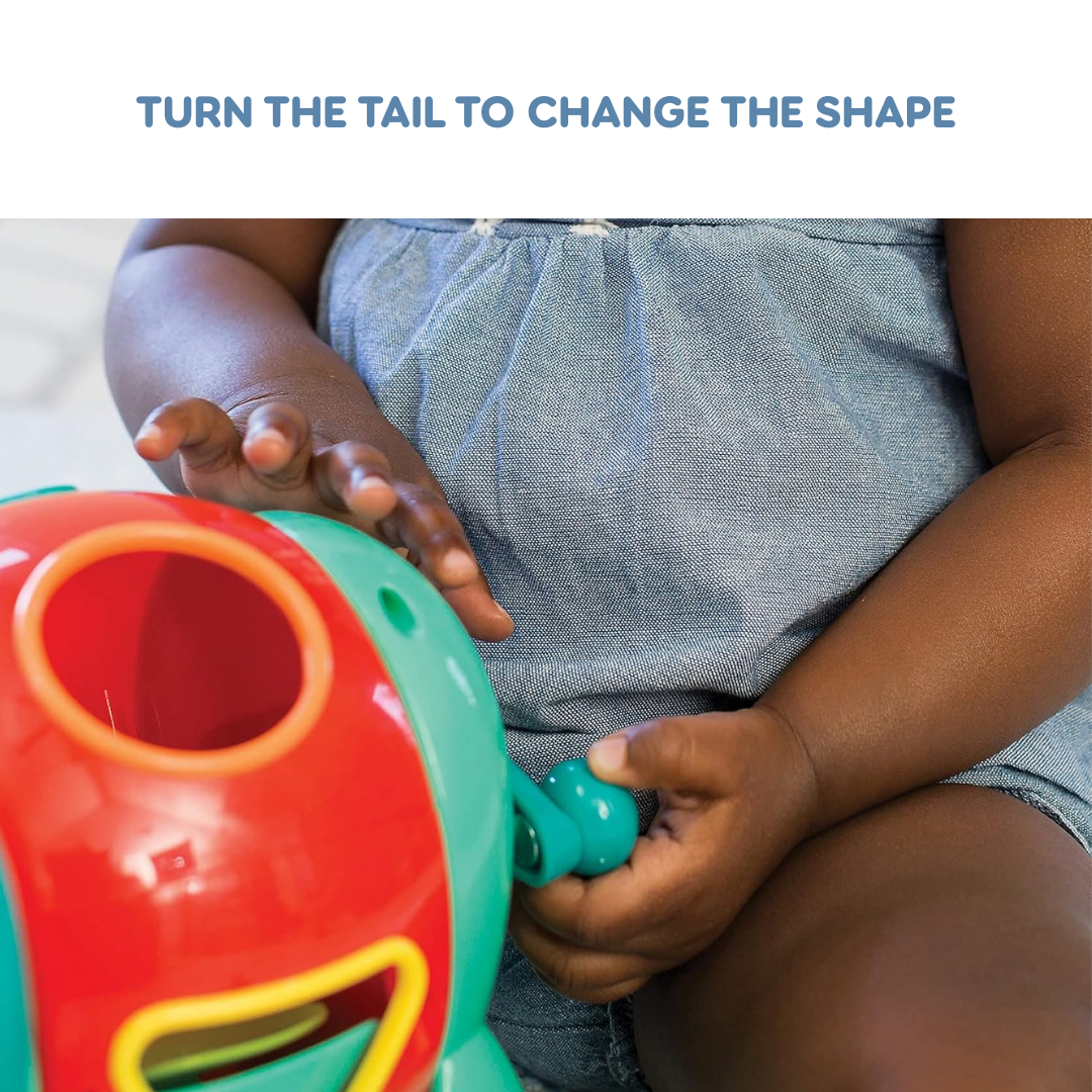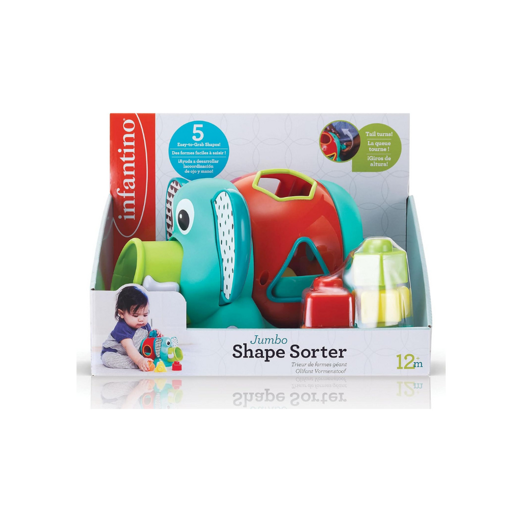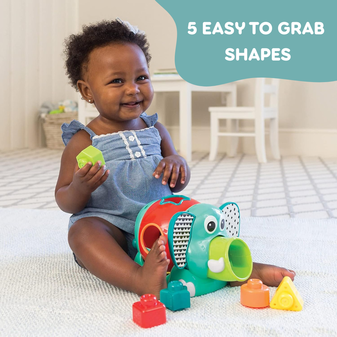 This fun elephant brings a fun new twist to the classic shape sorter! Sort five easy-to-grab shapes into the elephant's body. Turn his tail to rotate the body and change the shape on top. Shape colors match the borders, helping children learn shape and color matching. When sorting is done, press the elephant's ears and the shapes will tumble out of his trunk.