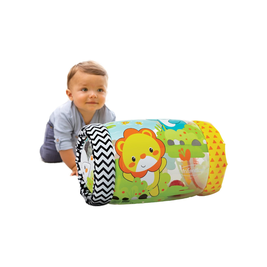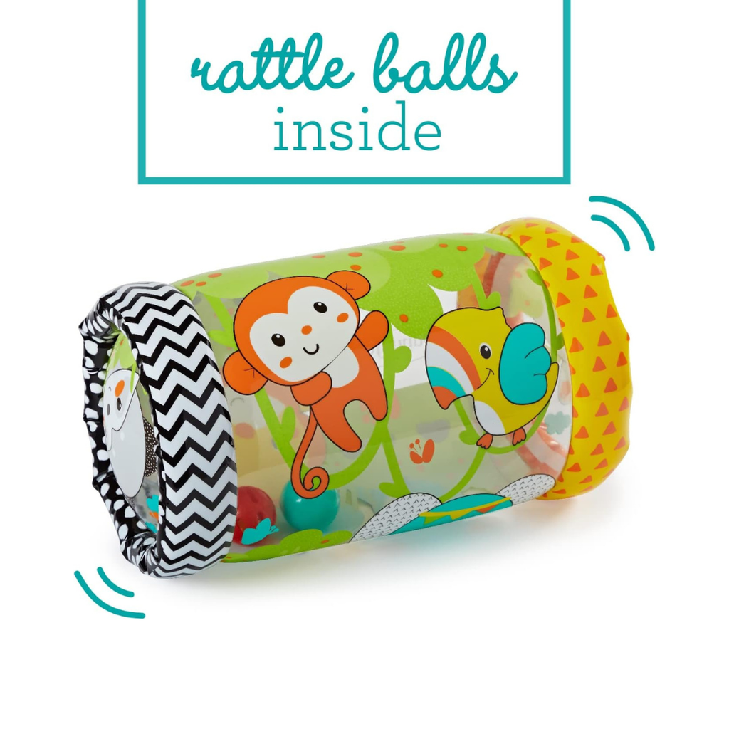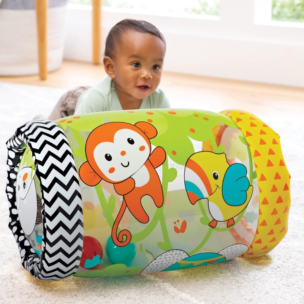 The Jungle Peek & Roll inflatable rolling toy encourages babies to push, peek through, and crawl with it. Inside are colorful balls that offer visual and auditory stimulus as they bounce and jingle with every roll. This jungle-themed “let's move” toy stimulates babies' senses and encourages movements that help develop gross motor skills. Made with BPA-free materials. Colorful rolling toy featuring 4 friendly jungle characters Balls bounce and jingle inside as toy rocks and rolls Helps build gross motor skills Inflatable for easy setup and storage.