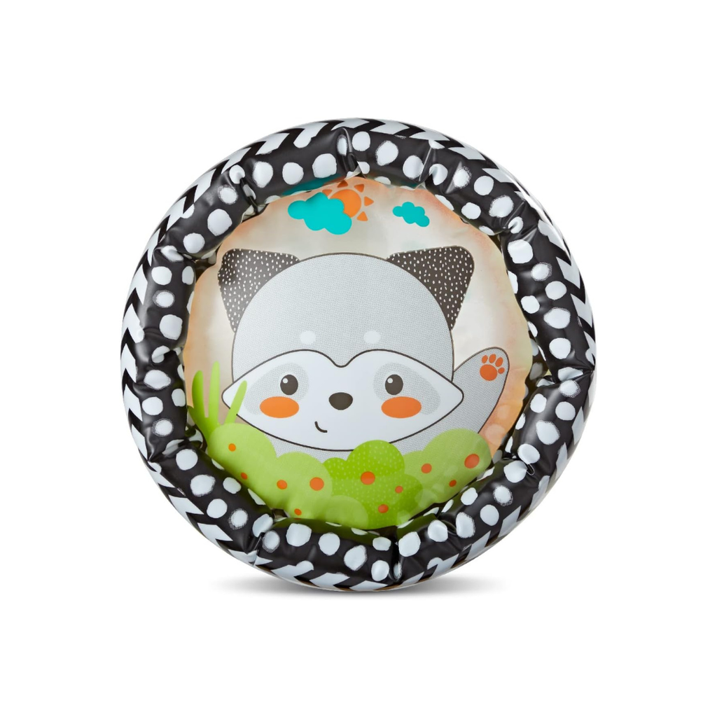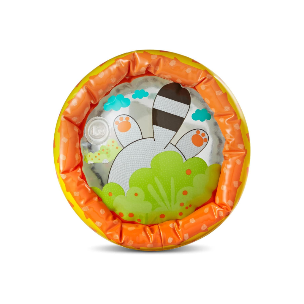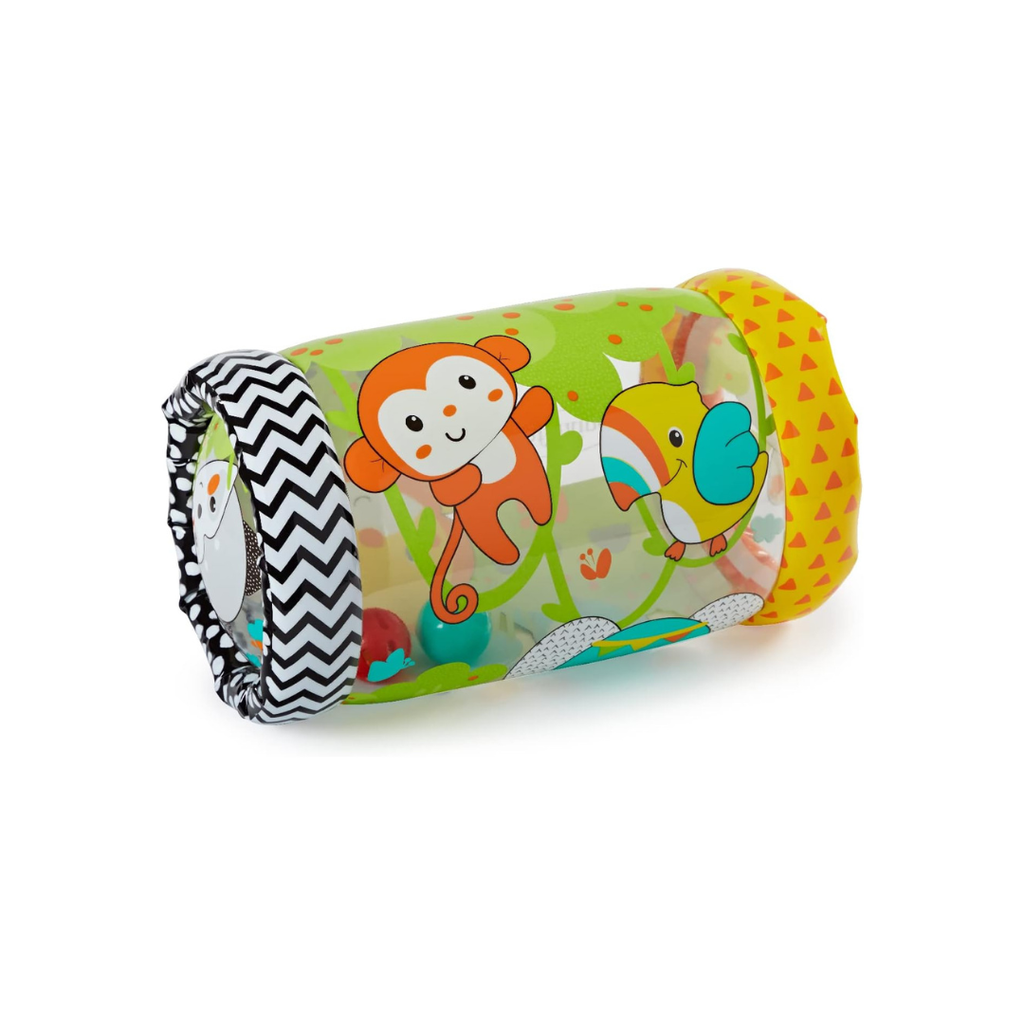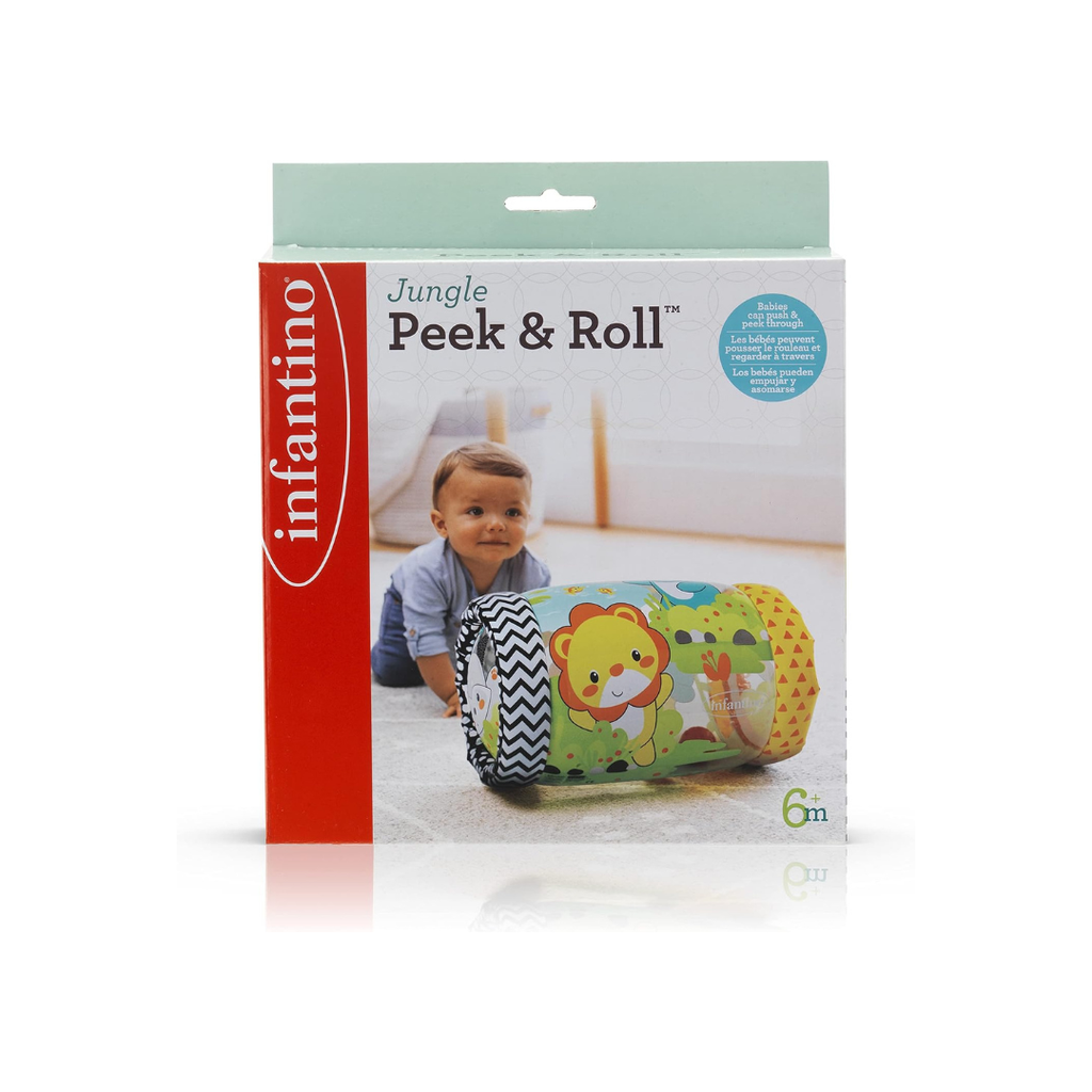 The Jungle Peek & Roll inflatable rolling toy encourages babies to push, peek through, and crawl with it. Inside are colorful balls that offer visual and auditory stimulus as they bounce and jingle with every roll. This jungle-themed “let's move” toy stimulates babies' senses and encourages movements that help develop gross motor skills. Made with BPA-free materials. Colorful rolling toy featuring 4 friendly jungle characters Balls bounce and jingle inside as toy rocks and rolls Helps build gross motor skills Inflatable for easy setup and storage.