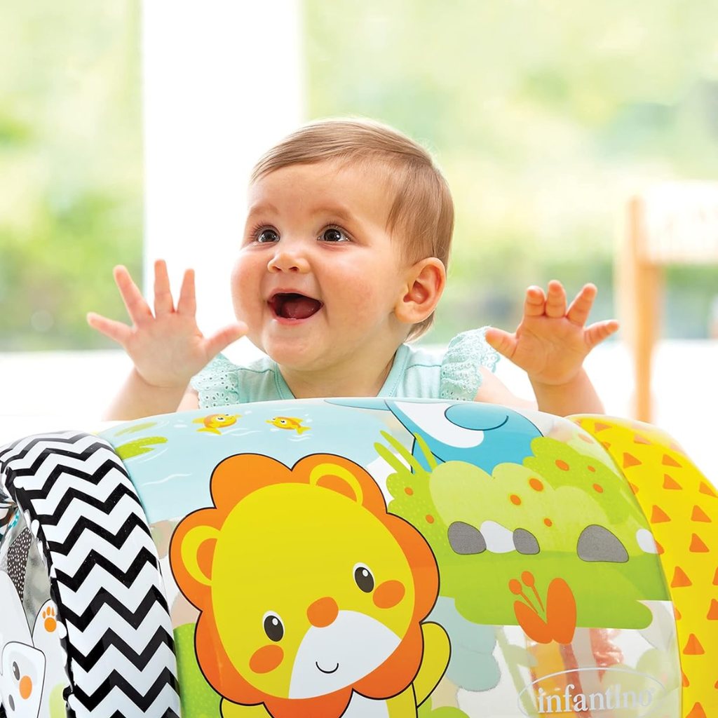 • Developmental activity: assists babies in developing their head, neck, shoulder, hand and leg muscles while playing; visual and auditory stimulation teaches cause and effect; encourages crawling for gross motor skills development