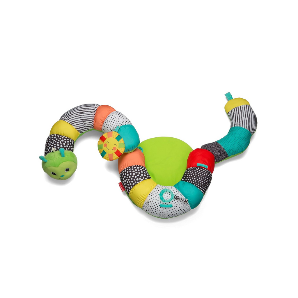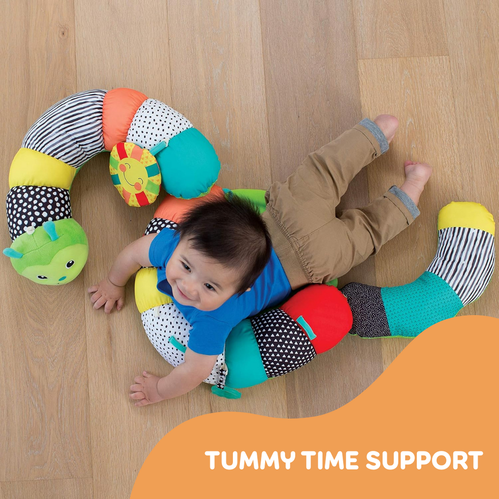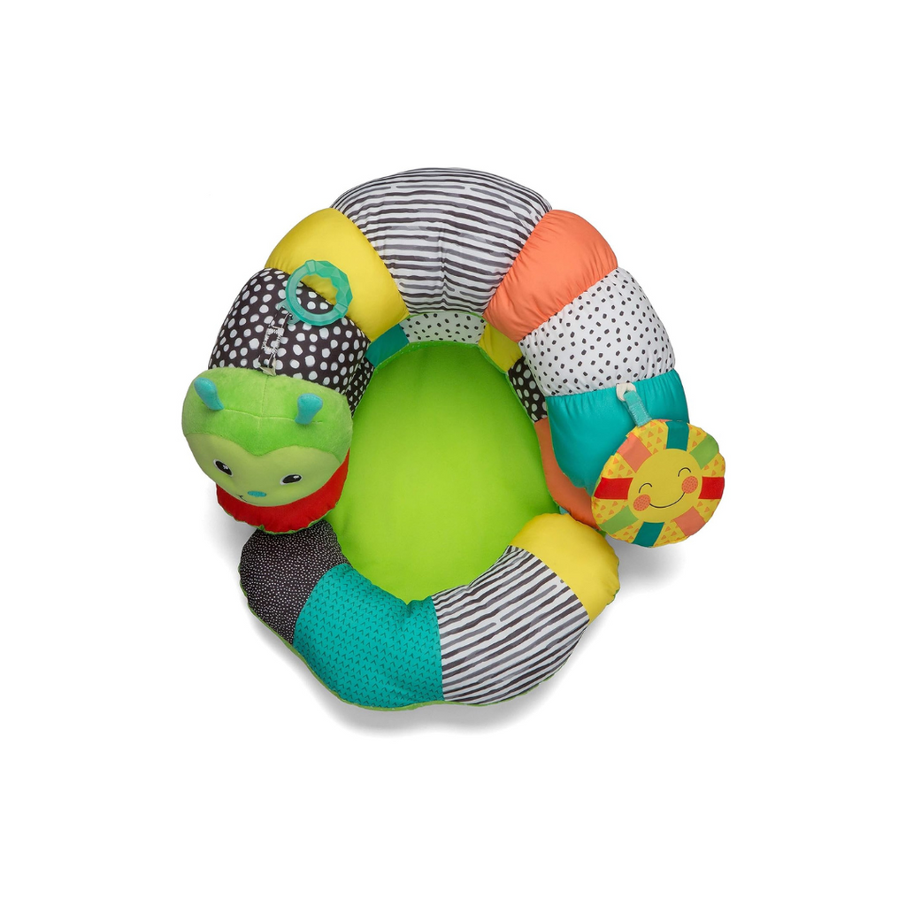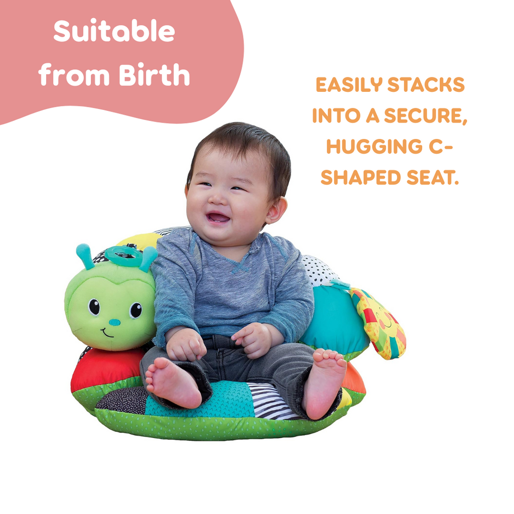Cuddle bug caterpillar begins as a playful, tummy time prop and transforms to a stacked, hugging seat support for beginners. Prop, play and cuddle up with this cute as a bug caterpillar. Extend this playful caterpillar for tummy time support, helping baby strengthen neck and back muscles while they engage with the soft, textured character and two detachable toys. Stack the caterpillar to create a secure "c" shaped seat positioner to support early sitters.