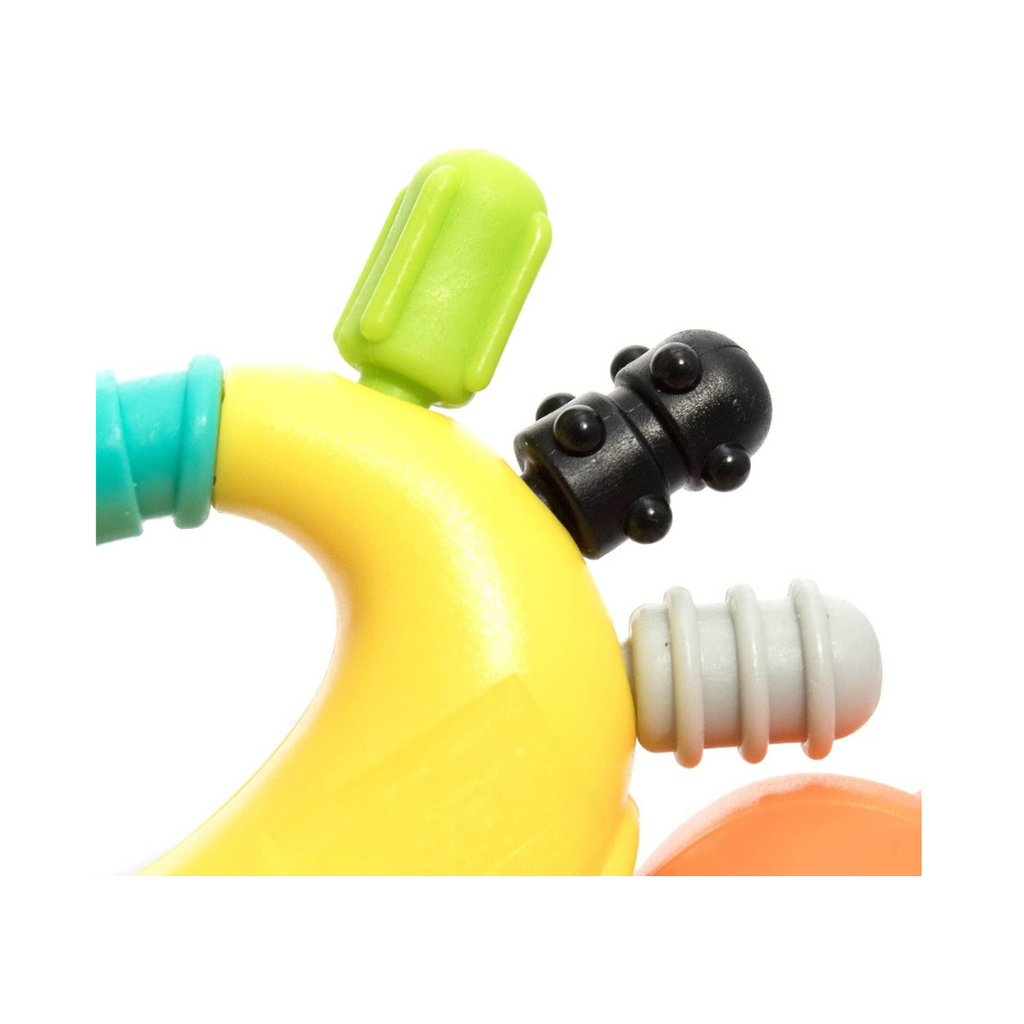 The safe rattle and teether will entertain and relieve the baby's sensitive gums during teething. Diverse textures encourage baby to explore with hands and mouth. The shape of the toy allows easy grasping by children's hands.