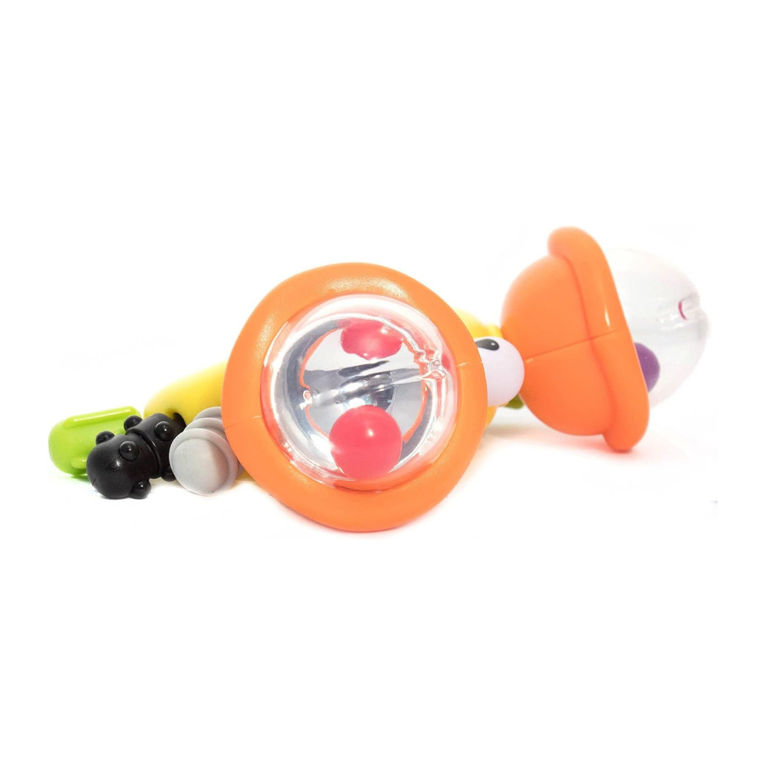 Sand crab with fun rattling pincers. Textured teething crab feet ideal for babies' oral exploration. Great audio and tactile stimulation response for growing infants. Secure carry handle design.