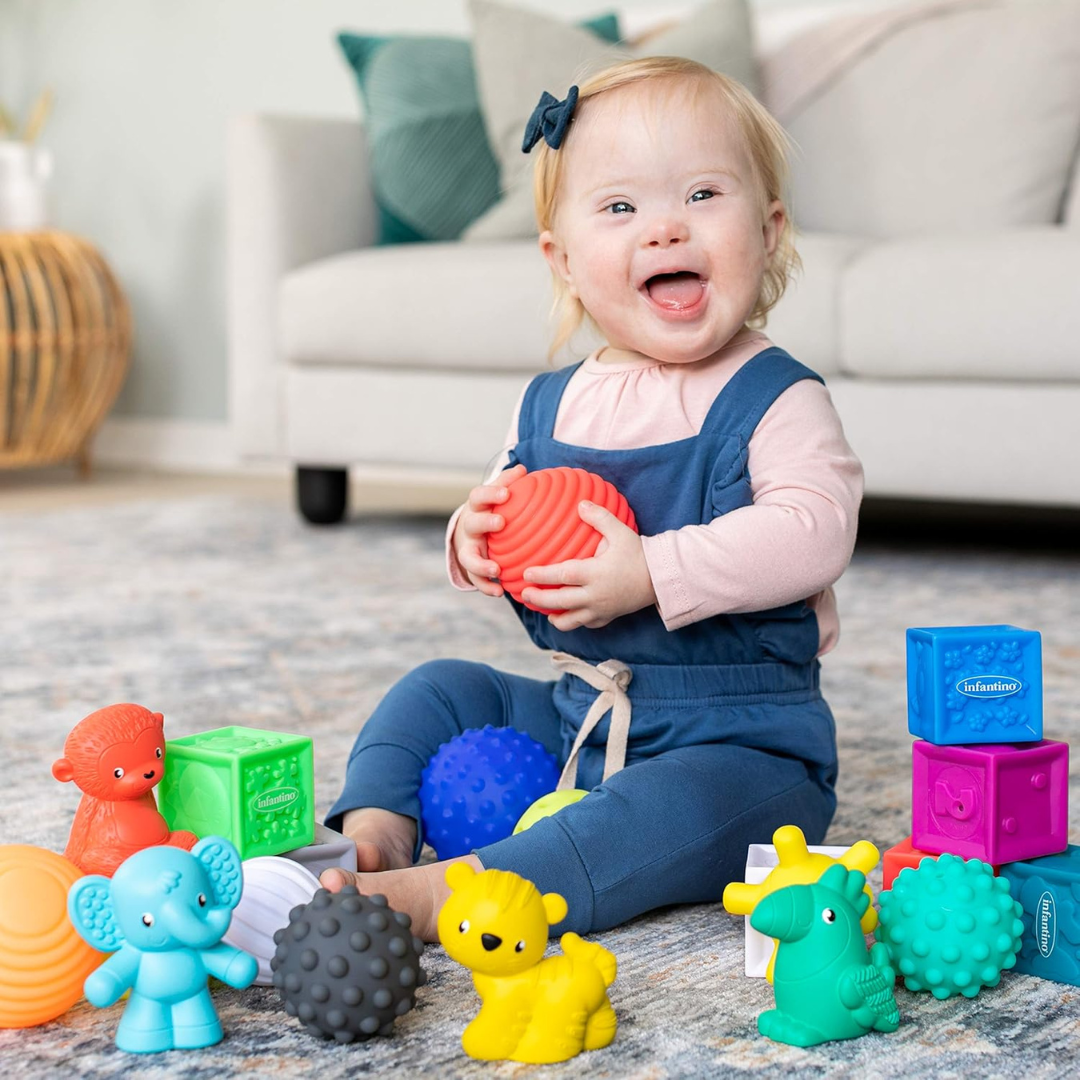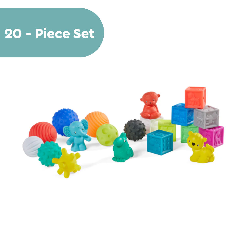Babies will love this big set of squeezable, teethable, baby basics. These textured blocks, balls, and animal buddies introduce numbers, colors, and animals with lots of open-play potential. 20 pieces in all.