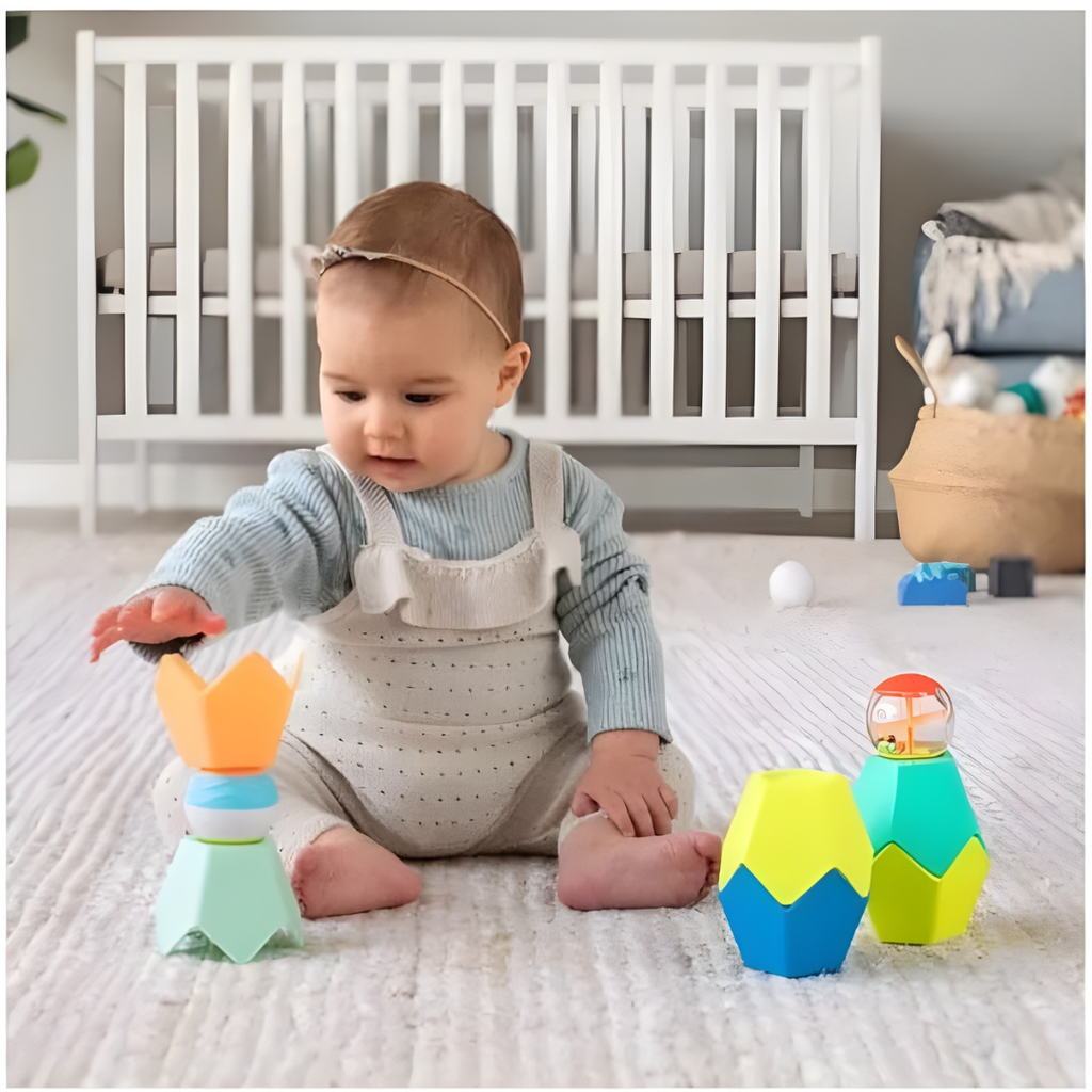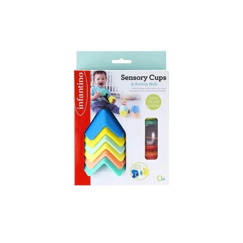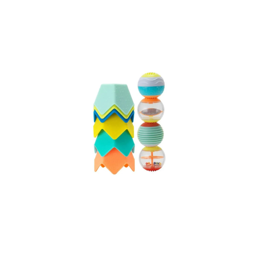 Little ones will love this multi textured, bright coloured busy basic set of must have classics. 6 uniquely shaped stacking cups add a pinch of flair to the age old development game of nesting and stacking. 4 connectable puzzle balls fit perfectly in little hands and inspire wonder from within with peek in and see activities.