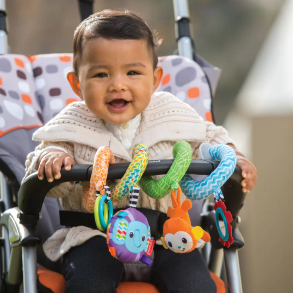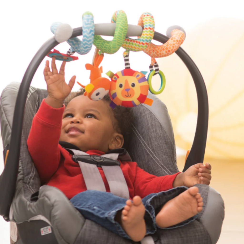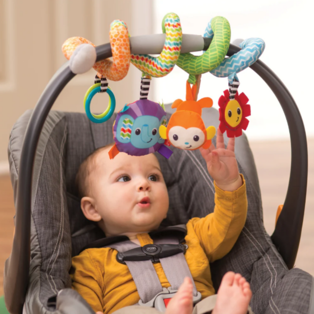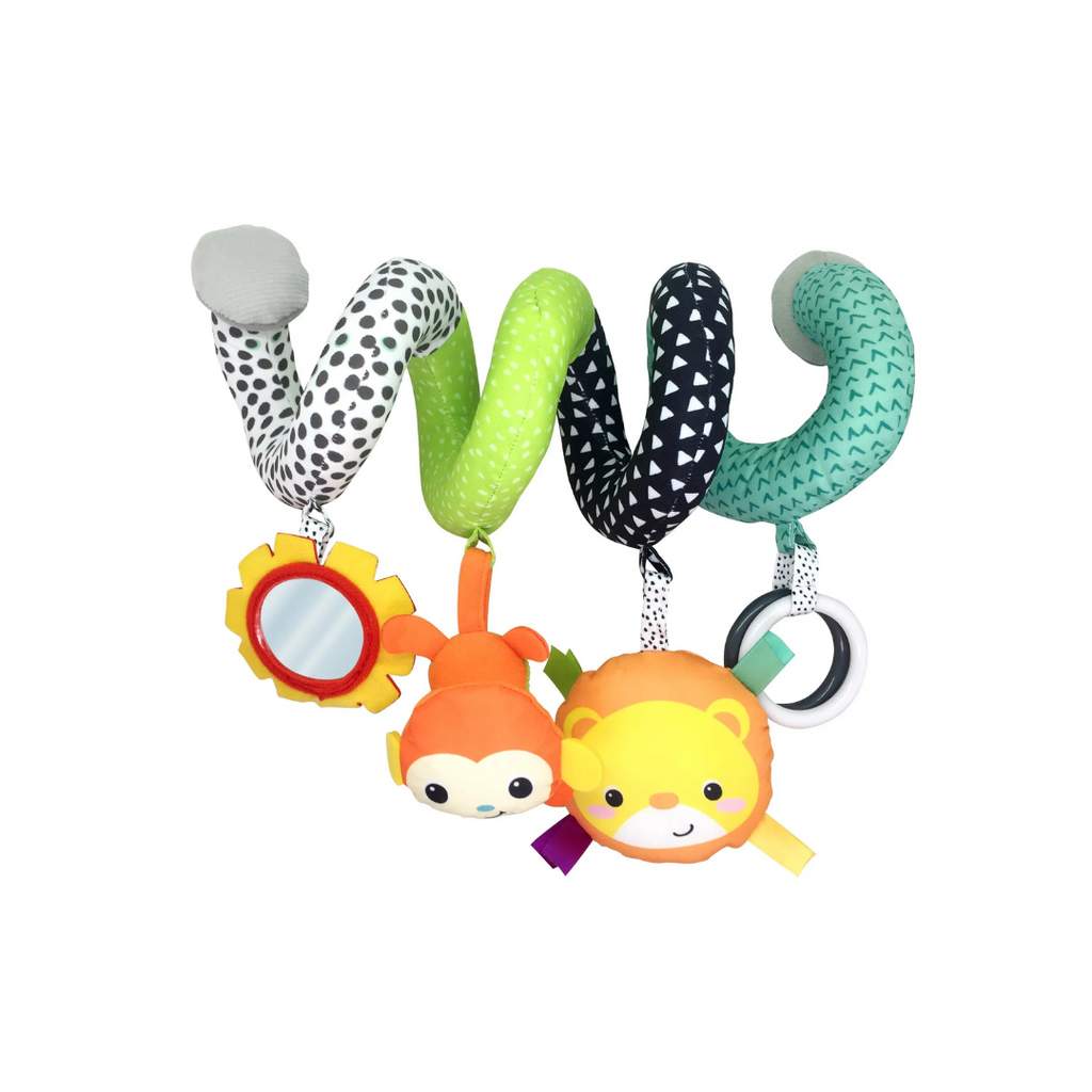 This soft activity spiral features four unique toys including a crinkle bee, animal rattle, clacker rings and a shiny mirror. Wraps around car seat handles and most strollers. Encourages reaching, grabbing and batting while keeping your little one engaged and interested.