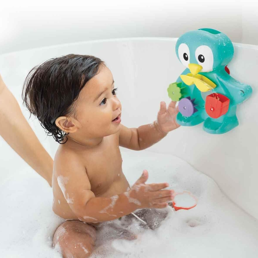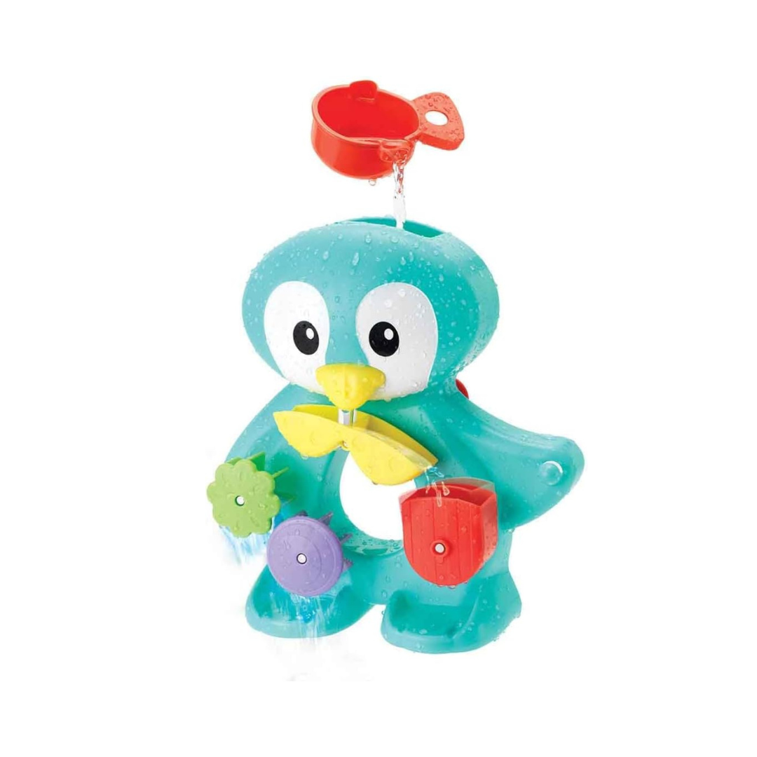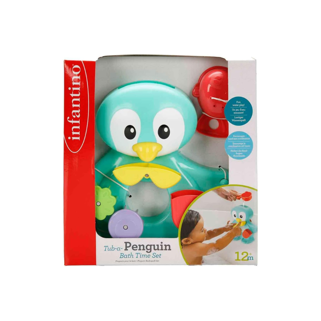 The Infantino Penguin Bath Toy is designed for children aged 12 months and older and includes a toy penguin with spinners and a water scoop.