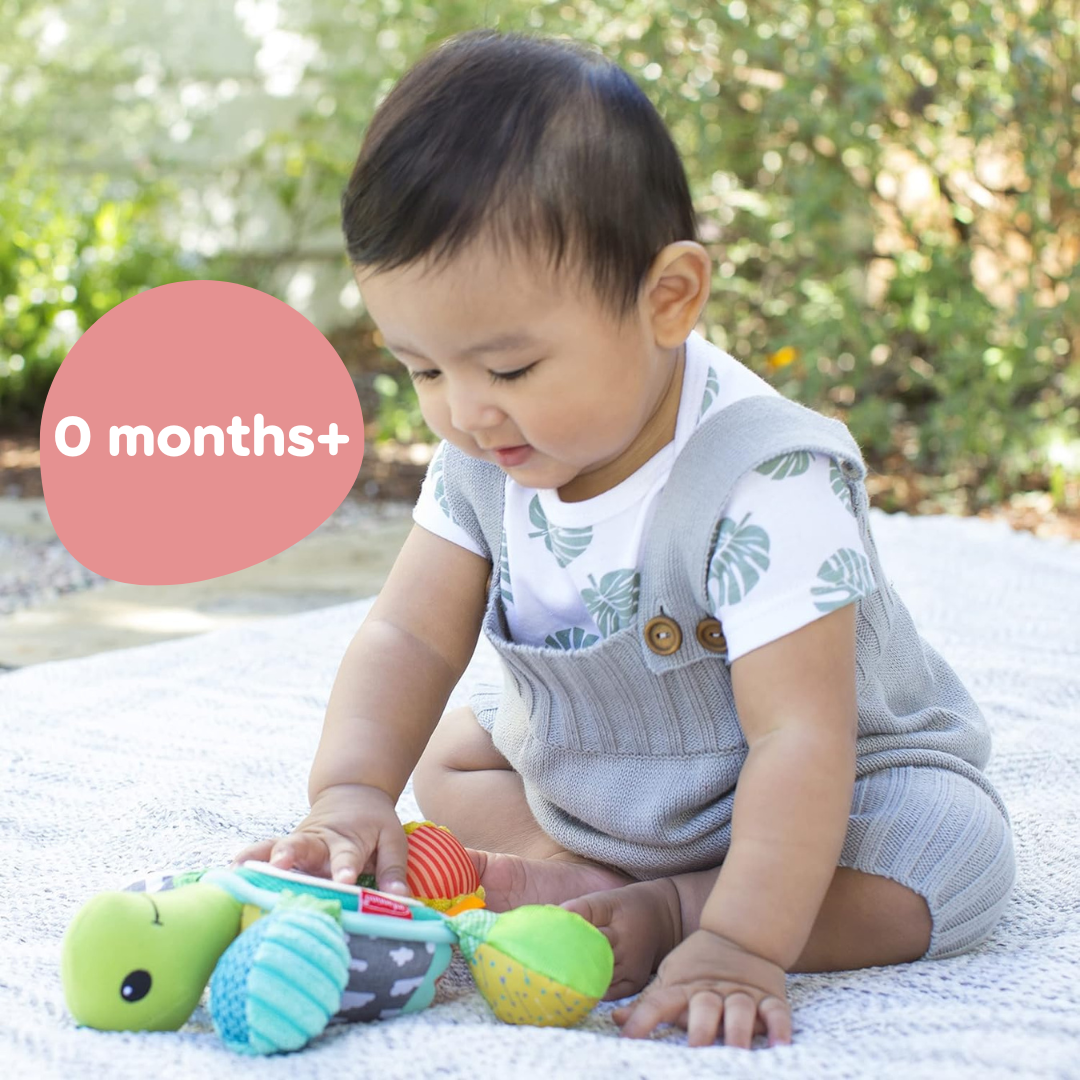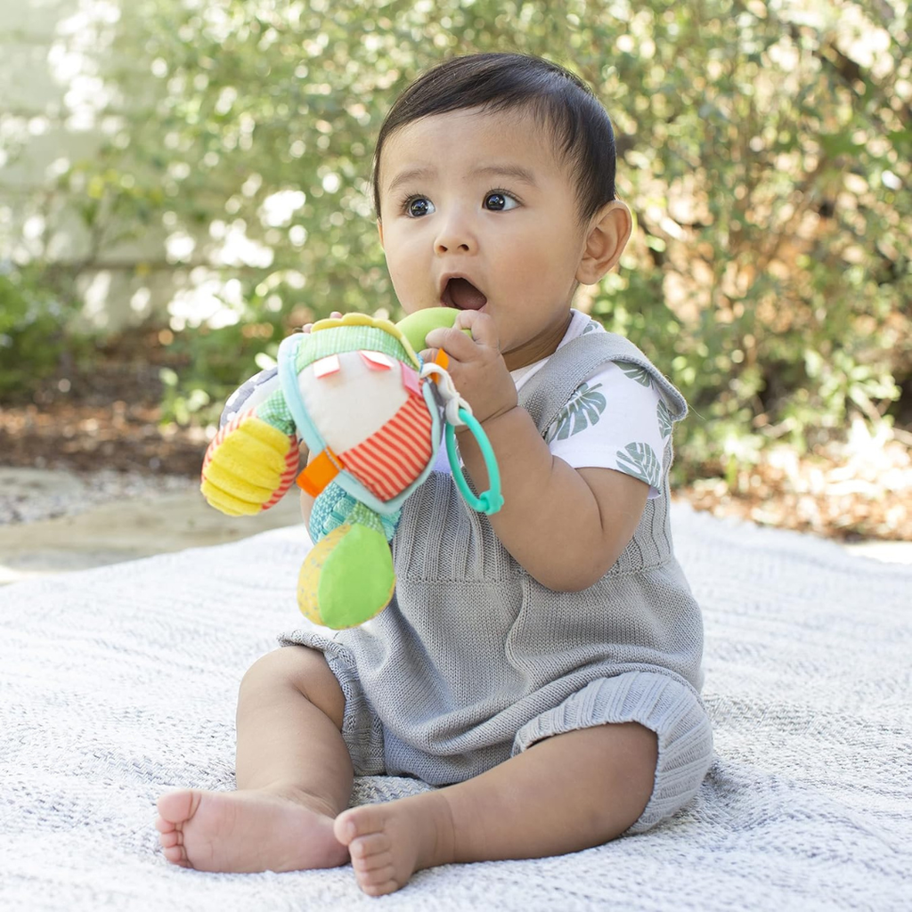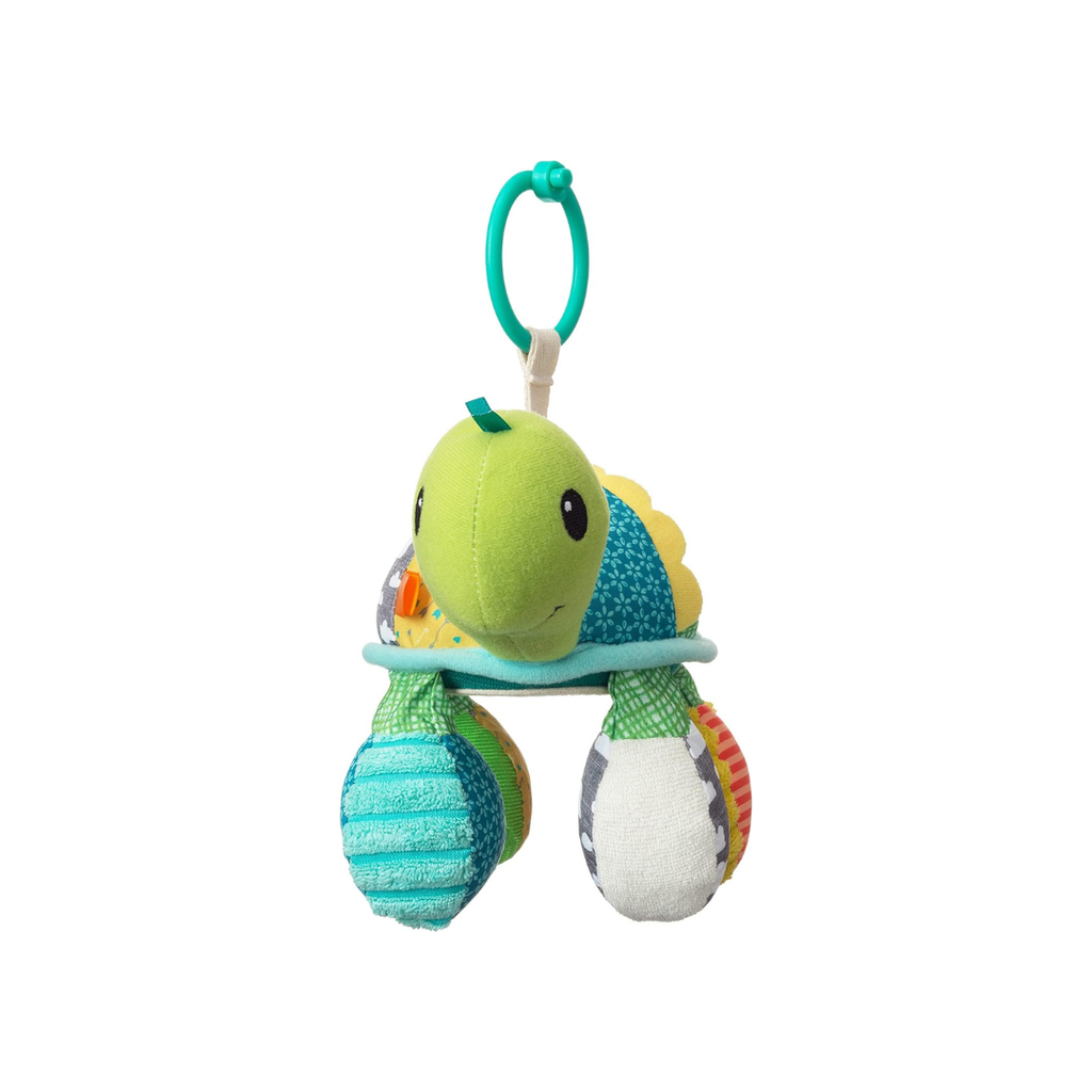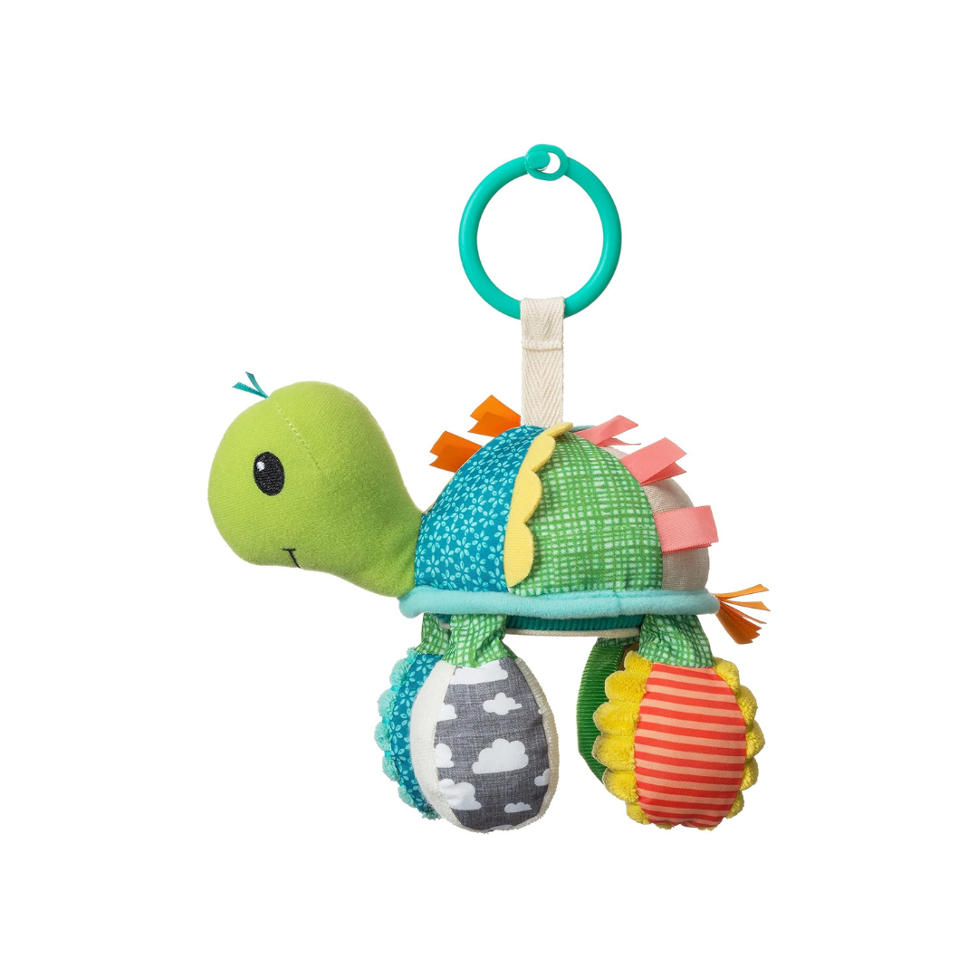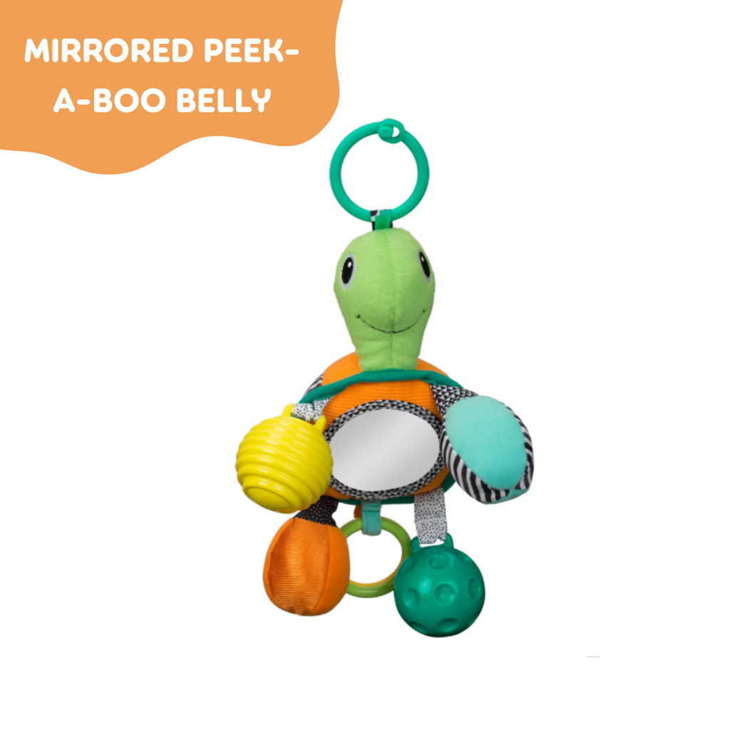 Turtle Mirror Pal stimulates your babies' senses and helps them explore the world. This friendly pal encourages reaching, grabbing, batting and lots of grins. His mirrored belly is perfect for peek-a-boo play. Shake him to hear an entertaining rattling sound. It features two rattle feet and two textured sensory ball feet. Attach the link to the Turtle's back or head to give your little one a different view of the rattling feet and mirror. This turtle links to car seats, strollers, activity gyms and more so you can take it on the go.