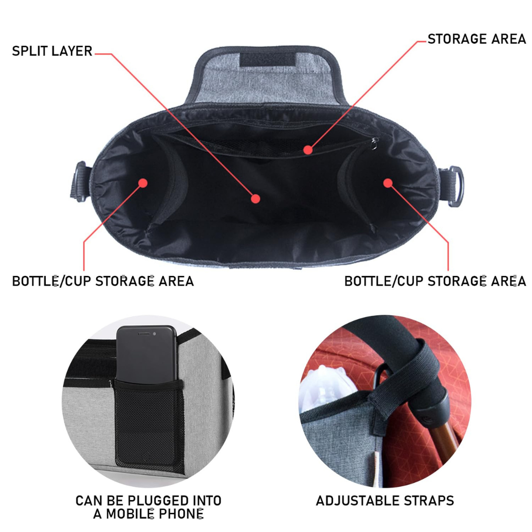 This insulated beverage and essentials caddy stretches to hold bottles and coffee cups securely, while providing easy access to your most important items. Fitting most stroller bars and handles, this organizer bag includes a detachable wristlet for errands and a headphone port for hands-free calls.