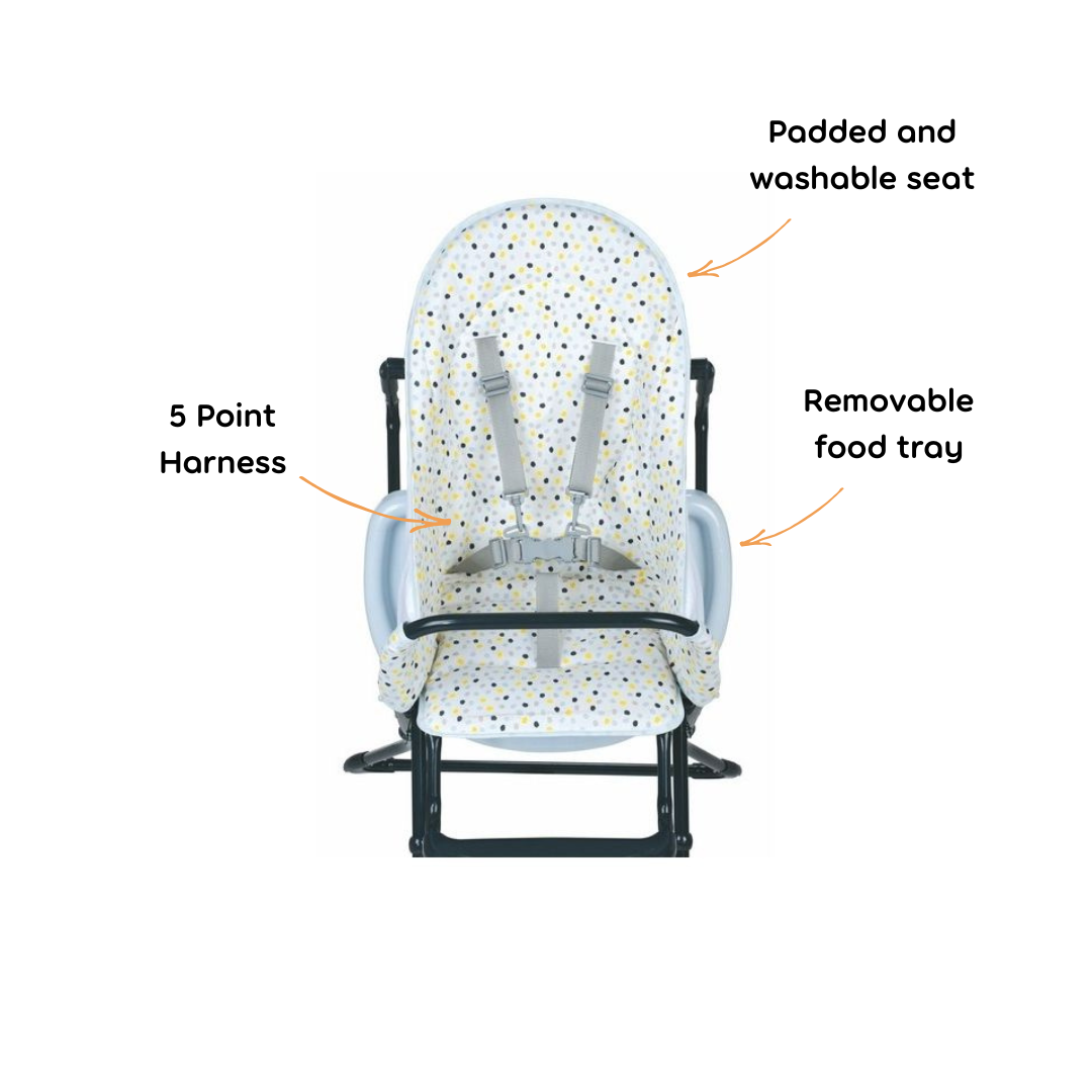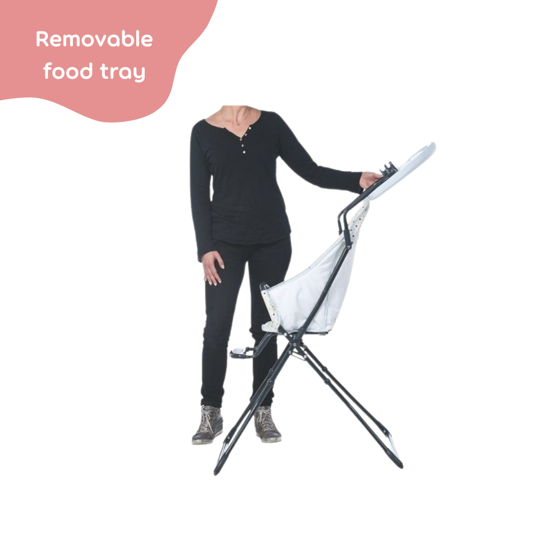 The folding high chair Kanji Gray Patches from Safety 1st is a compact and very lightweight high chair. This cheerful high chair with a comfortable and washable seat is suitable for children from six months up to a maximum of 15 kg - about three years. Because you can fold the Safety 1st high chair very flat, this dining chair is ideal for small spaces.