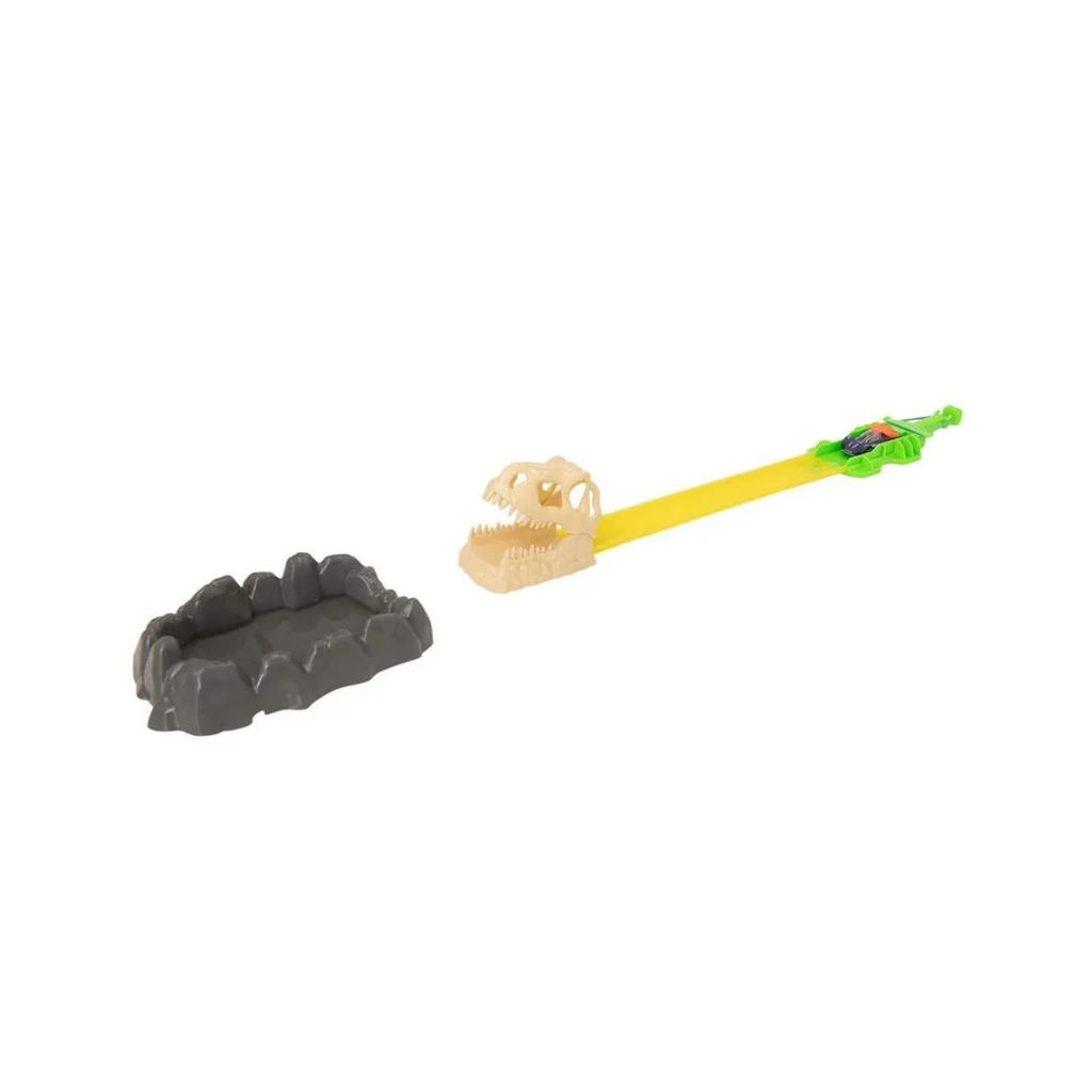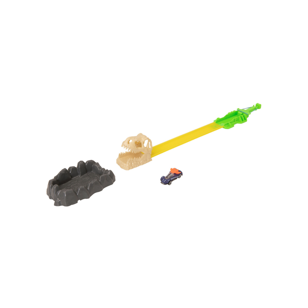 Track Set includes pull back launcher, 30cm of track, a dinosaur head, and a rocky pool to fill with warm or icy cold water for the full colour change experience.