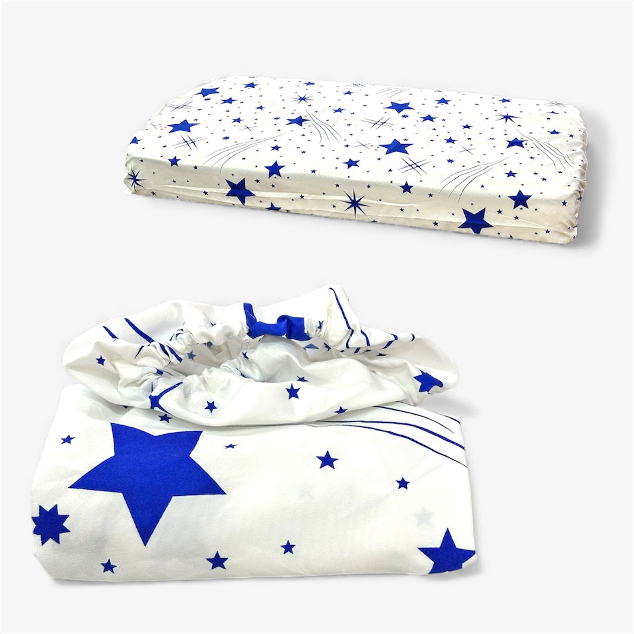 Create a dreamy sleeping space with this blue fitted sheet decorated with clouds, stars, and moons in soothing tones of blue, grey, white, and golden yellow. Perfectly fitted for a 60x120 cm cot, it’s crafted from 100% soft cotton for comfort and breathability. The secure elastic edges keep the sheet firmly in place, giving your little one a safe and cozy rest.